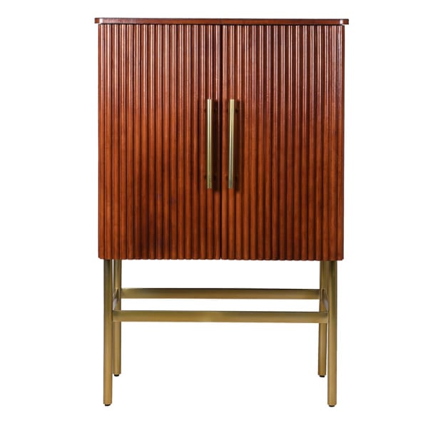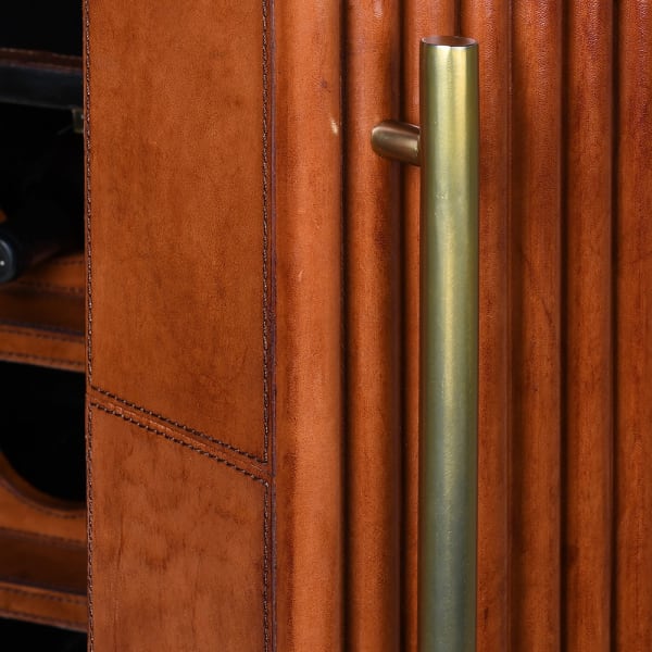 Barek na alkohole Jaipur wyróżnia się pionowo ryflowanym frontem, ręcznie obrabianą skórą oraz eleganckimi detalami, które podkreślają jego luksusowe wykończenie. Ciepły odcień brązu pięknie współgra z mosiężnym połyskiem podstawy, dzięki czemu mebel doskonale prezentuje się w salonie, eleganckiej jadalni, gabinecie lub apartamencie urządzonym w stylu premium.