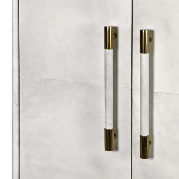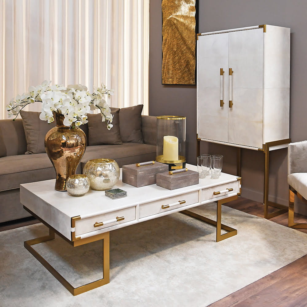 Pokrycie skórą w jasnym kolorze powoduje, że jest to wyjątkowo ekskluzywny element wystroju wnętrza. Barek na alkohol okaże się nie tylko praktycznym miejscem przechowywania lampek, kieliszków i alkoholu, ale i olśniewającą dekoracją wnętrza. Wnętrze zostało wyłożone aksamitem. Luksusowego charakteru dodają proste nogi w kolorze złotym, wykonane ze stali nierdzewnej.