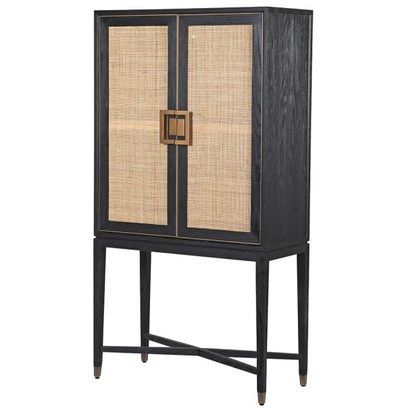Całość frontów wykonana została z naturalnego rattanu, który dodaje temu barkowi lekkości i sprawia, że idealnie będzie on wpisywać się w wystrój wnętrz w różnym stylu. Podkreśleniem stylowego charakteru mebla są detale wykończone w kolorze mosiądzu: żelazne nóżki oraz ciekawe uchwyty. Wnętrze tego barku zostało wykończone z efektem lustra.