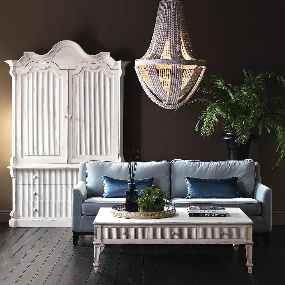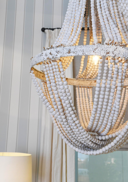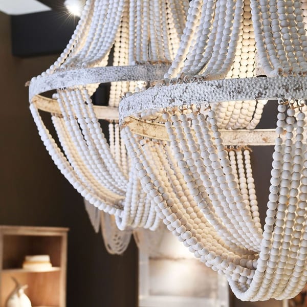 Ten drewniany żyrandol z koralikami doskonale sprawdzi się jako główne oświetlenie w salonie lub jadalni, nadając wnętrzu przytulności, ciepła i unikatowego charakteru. Subtelne postarzanie i dekoracyjne przetarcia podkreślają jego artystyczny styl.