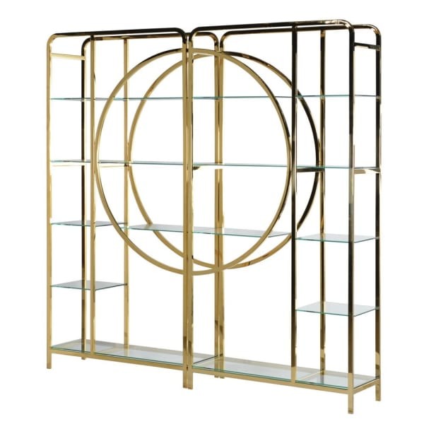 Elegancki, złoty regał Chesham to unikatowy element wystroju wnętrz. Wykonany ze stali nierdzewnej i szkła, utrzymany w stylu art deco, składa się z dwóch osobnych jednostek, które połączone dają niezwykły efekt i kształt.