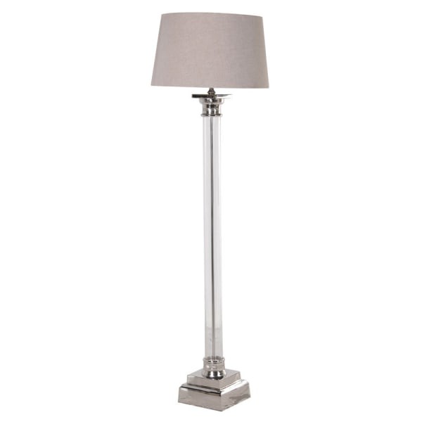 Luksusowa lampa podłogowa z abażurem Clear Luxury urzeka oryginalnym projektem oraz ekskluzywnym wykonaniem. Szklana lampa stojąca, której podstawę okala niklowany element, wyróżnia się unikatowym charakterem