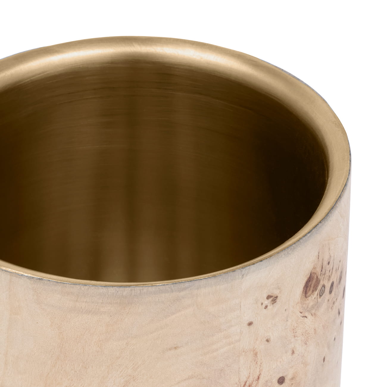 Model ten posiada ciepłą okładzinę z forniru burl, która otacza stalowy wkład w tonacji postarzanego, szczotkowanego mosiądzu. Subtelne połączenie naturalnego drewna i metalu tworzy elegancki kontrast, nadając całości ponadczasowy wygląd.