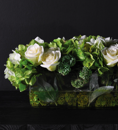 Ekskluzywna kompozycja sztucznych kwiatów premium to elegancka dekoracja wnętrza, która łączy ponadczasową estetykę z wygodą codziennego użytkowania. Zestawienie zielonych hortensji, róż oraz rozchodnika tworzy dopracowaną aranżację o subtelnym, świeżym charakterze. Całość została umieszczona w podłużnym szklanym naczyniu o długości 55 cm, co nadaje dekoracji nowoczesny i wyrafinowany wygląd.