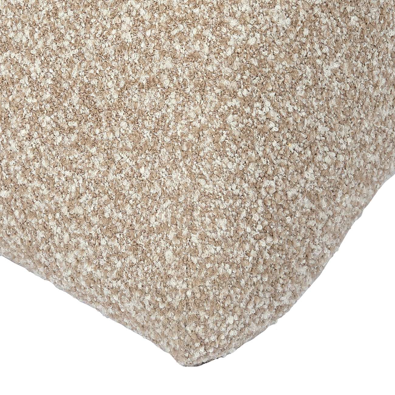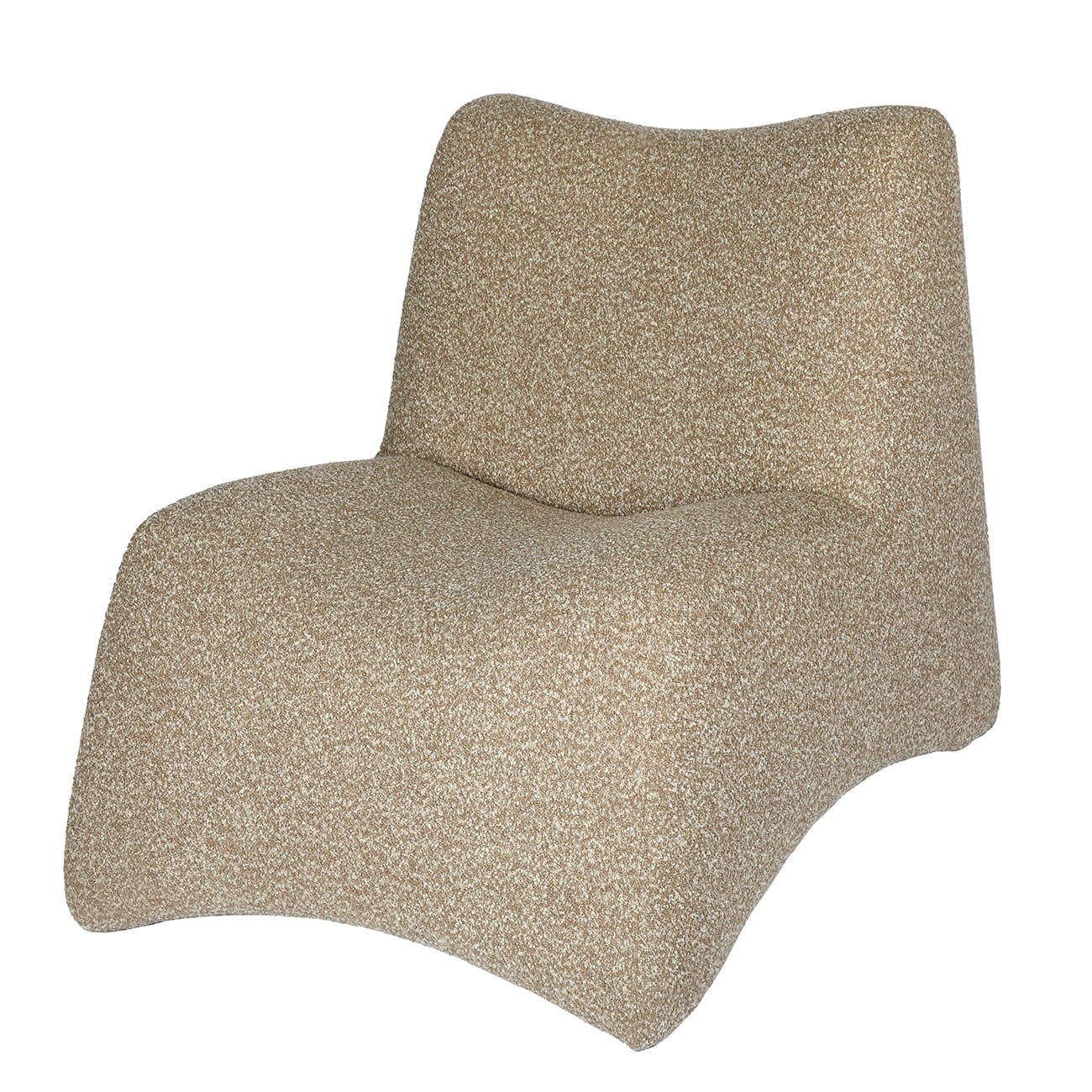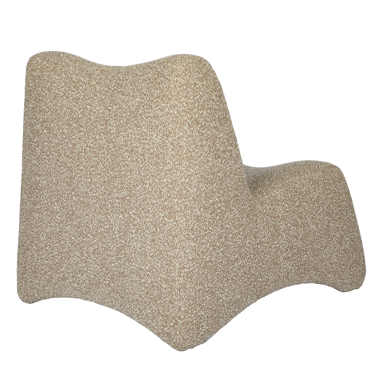 Fotel oraz podnóżek zostały tapicerowane miękką tkaniną boucle w ciepłym, ziemistym odcieniu beżu, której wyrazista struktura wprowadza do aranżacji głębię i naturalną miękkość. Gęsty, teksturowany splot nadaje meblom przyjemną w dotyku powierzchnię oraz podkreśla ich luksusowy charakter.