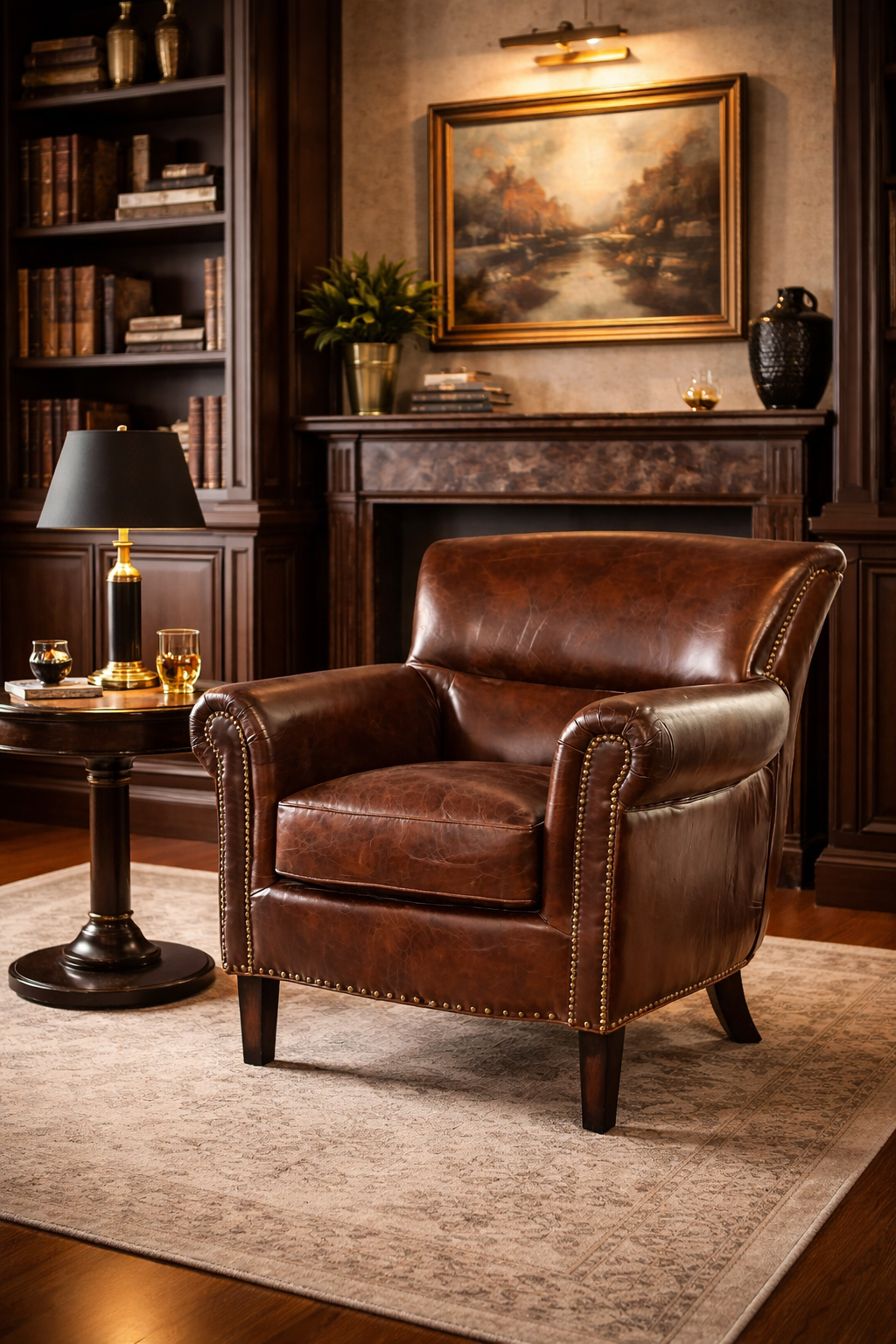 To elegancki fotel skórzany do salonu, biblioteki, gabinetu lub luksusowej strefy wypoczynkowej. Klasyczna forma, naturalne materiały i ręczne wykończenie czynią z niego wyjątkowy element aranżacji, który wnosi do wnętrza prestiż, ciepło i ponadczasowy styl.