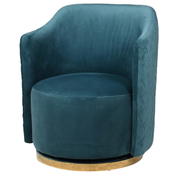 Niebieski fotel obrotowy do salonu – elegancki fotel koktajlowy na złotej podstawie