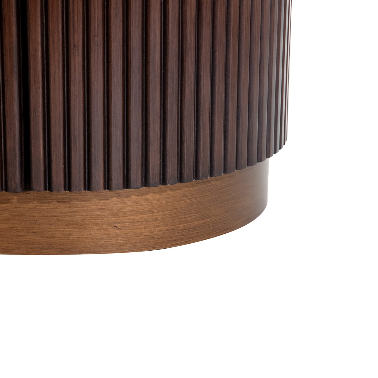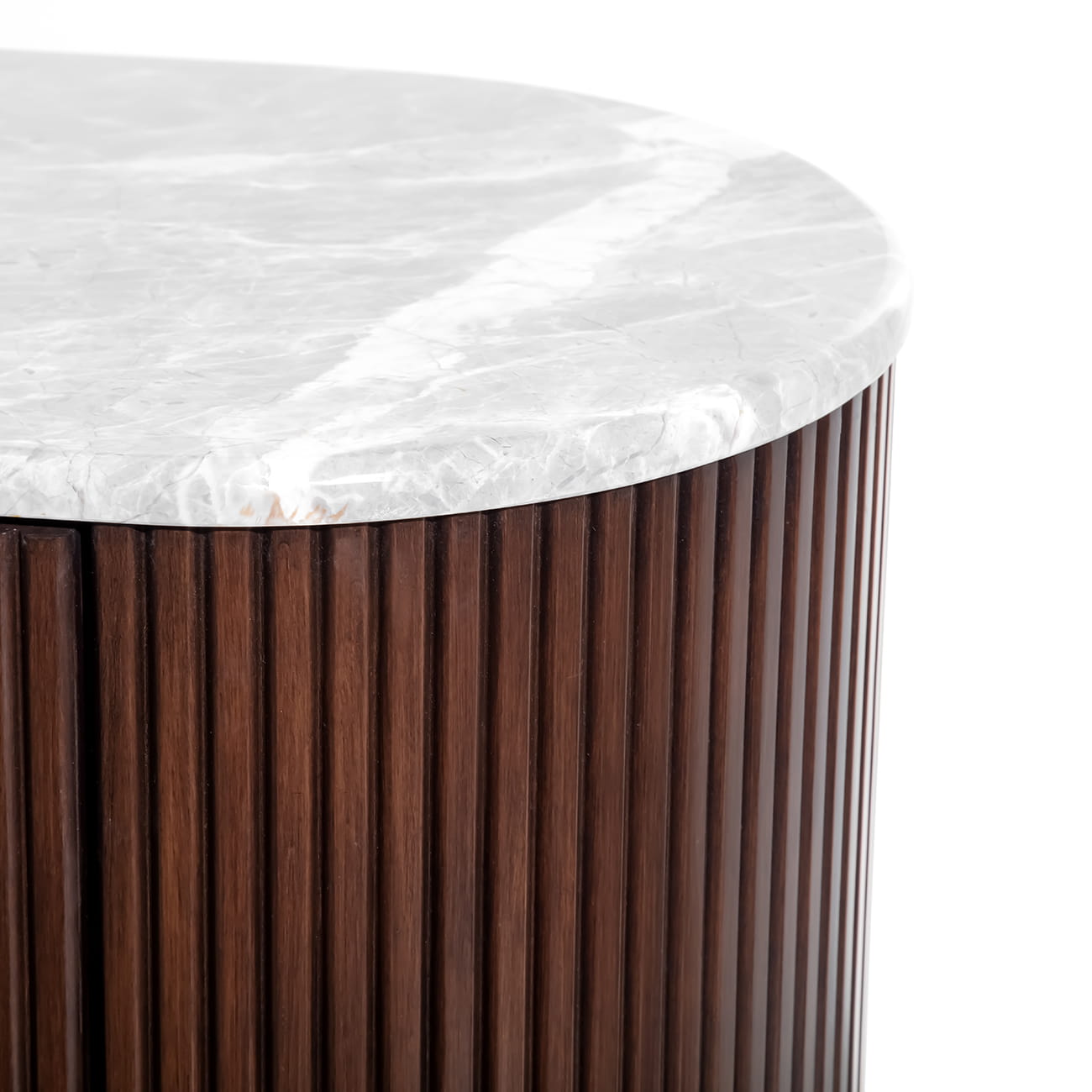 Poniżej blatu znajduje się efektowny, ryflowany front z drewna kauczukowego wykończony w głębokim, orzechowym kolorze. Dwie drzwi otwierane są w systemie push-to-open, co pozwala zachować idealnie gładką, minimalistyczną linię bez uchwytów i podkreśla nowoczesny charakter mebla.