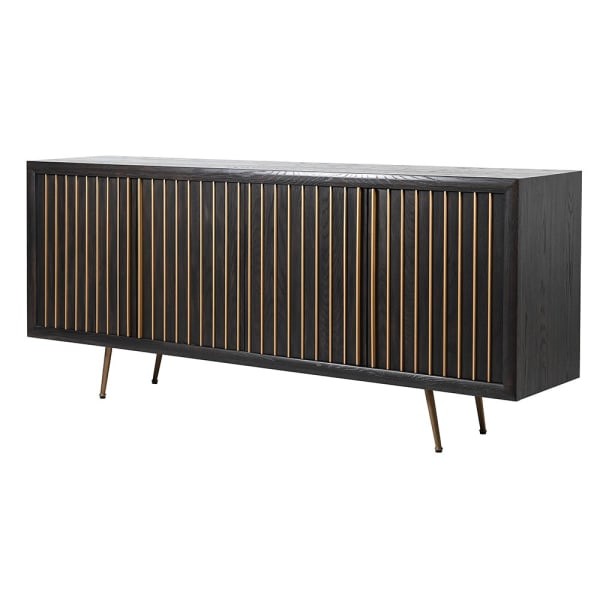 Ten duży brązowy bufet bez wątpienia wyróżnia się oryginalnym projektem oraz cudownie wykonanymi detalami. Czterodrzwiowa szeroka na 200 cm komoda wykonana została z drewna sosny i dębu, z ciekawie zaznaczonymi frontami, w których zainstalowano podłużne złote szczebelki wykonane z żelaza. Główna konstrukcja umieszczona została na nóżkach ze stali nierdzewnej, które dodają tej bardzo dużej komodzie lekkości i subtelnego stylu.