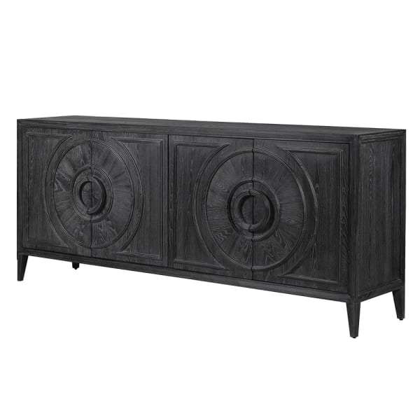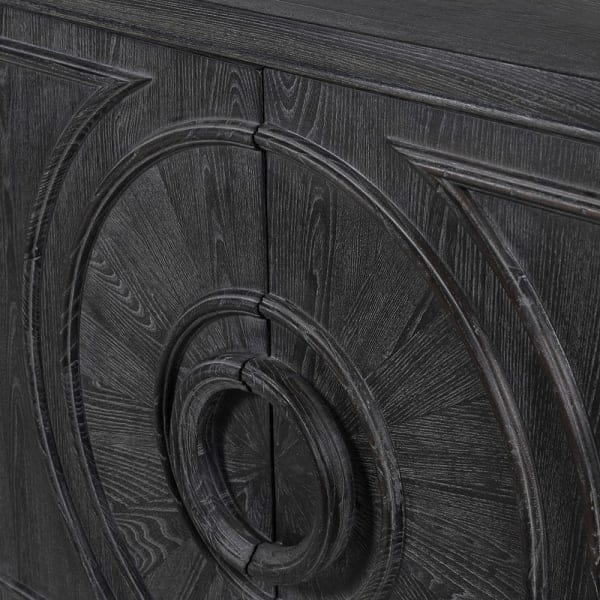 Ekskluzywna czarna komoda Black Oracle to prawdziwa ozdoba każdego luksusowego wnętrza. Wykonana z wysokiej jakości drewna wiązu (elm), wyróżnia się niezwykłą formą drzwi o rzeźbionym, koncentrycznym wzorze. Ten unikatowy design przyciąga wzrok i sprawia, że mebel staje się centralnym elementem aranżacji salonu, jadalni lub przestronnego holu.