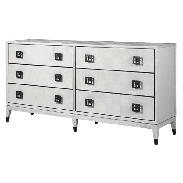 Fronty wykonane zostały z dębu i sklejki, co zapewnia trwałość i solidność konstrukcji. Minimalistyczne czarne elementy – żelazne nóżki oraz stylowe uchwyty – podkreślają nowoczesny charakter mebla i sprawiają, że komoda doskonale komponuje się z wnętrzami w różnym stylu: klasycznym, loft, nowojorskim czy glamour.