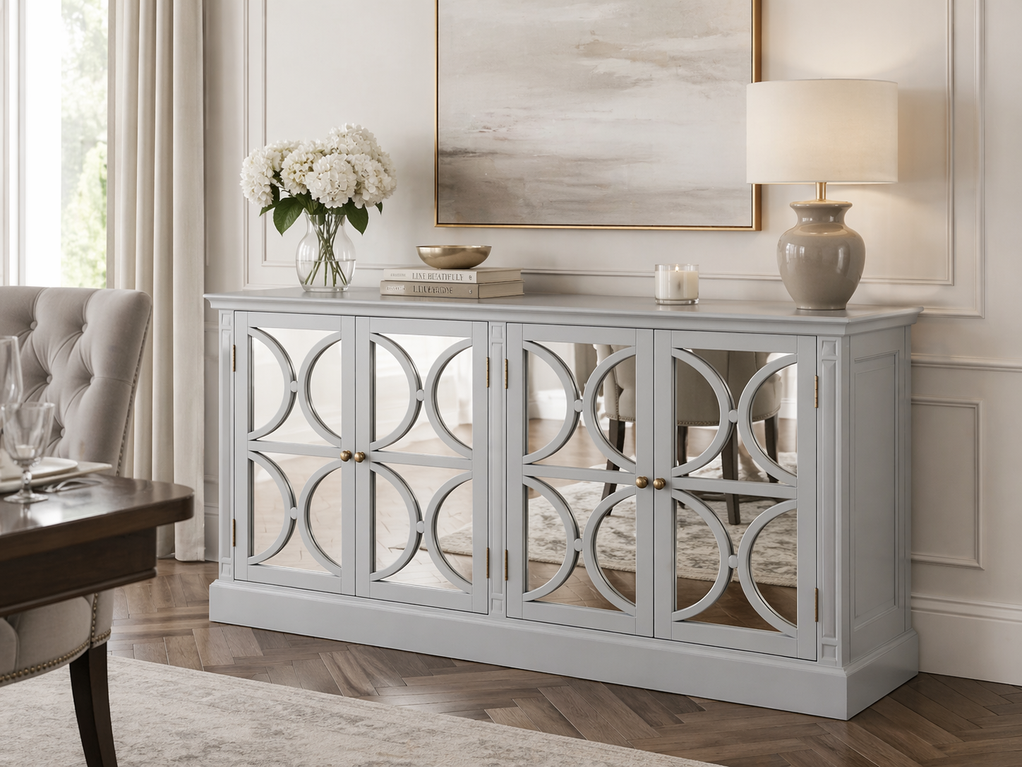 Komoda bufet Minor Grey 189x94 cm Drewno i lustrzane szkło komoda czterodrzwiowa