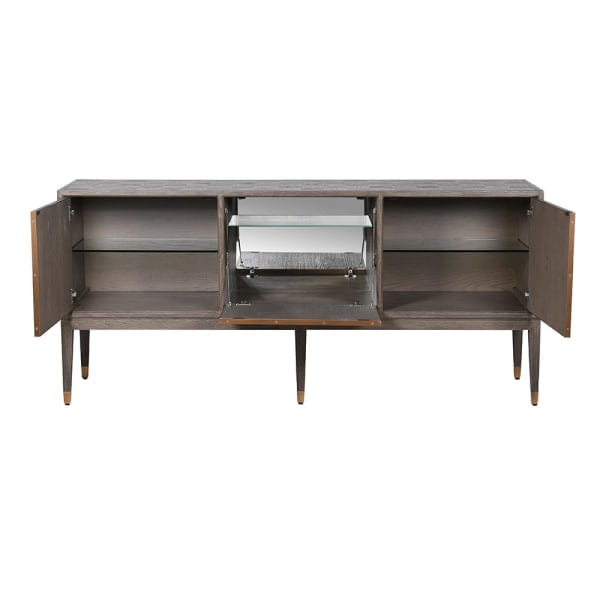 Front komody tworzą trzy zamykane drzwi, które kryją pojemne przestrzenie do przechowywania. Dzięki temu z łatwością uporządkujesz zastawę, tekstylia, dokumenty lub inne domowe akcesoria. Charakterystyczne uchwyty w kolorze mosiądzu nadają meblowi wyrazistości i przyciągają wzrok, podkreślając jego luksusowy charakter.
