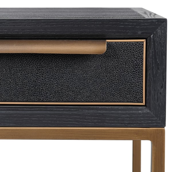 Blat oraz fronty wykonane są z drewna dębu, wykończone w głębokiej czerni, która dodaje meblowi nowoczesnej elegancji. Smukła rama z żelaza w odcieniu szczotkowanego złota tworzy luksusowy kontrast i podkreśla charakter całej kolekcji Primrose.