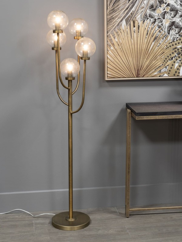 Ta ekskluzywna lampa stojąca jest wyposażona w pięć szklanych kloszy. Poza oryginalnym designem wyróżnia się także rozmiarem - jej wysokość to 137 cm.