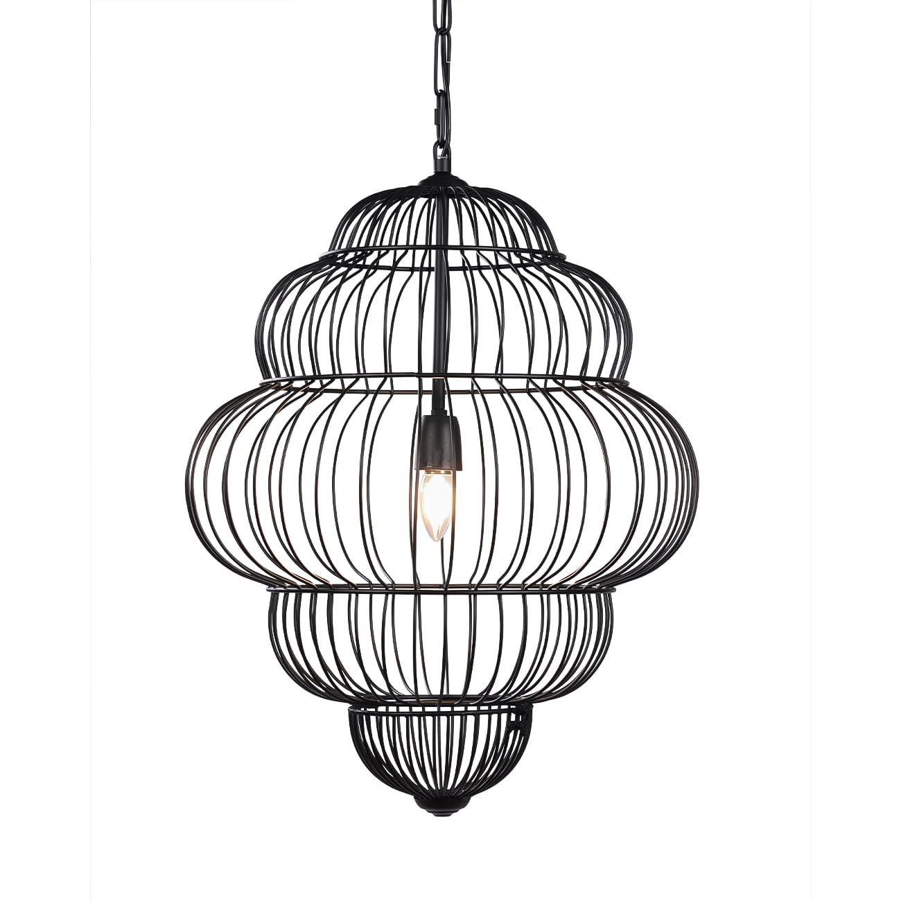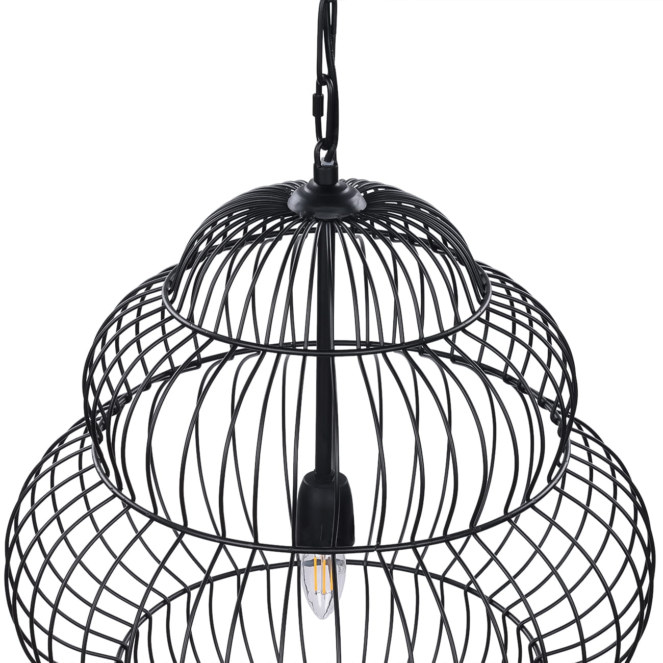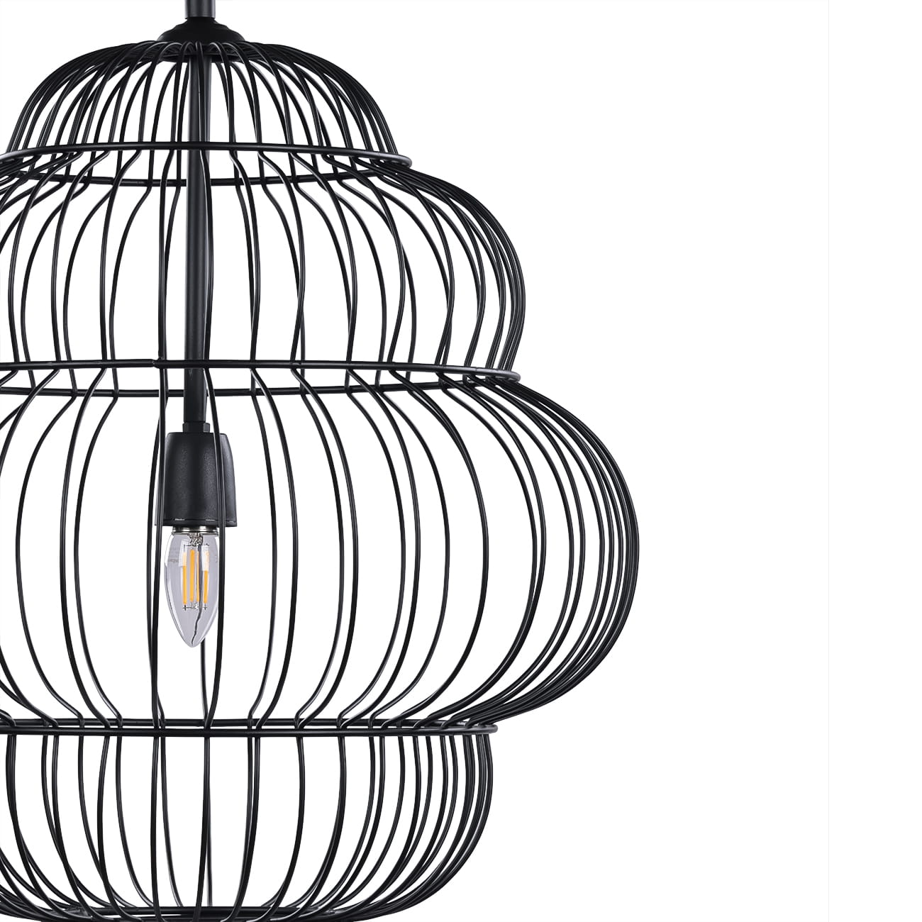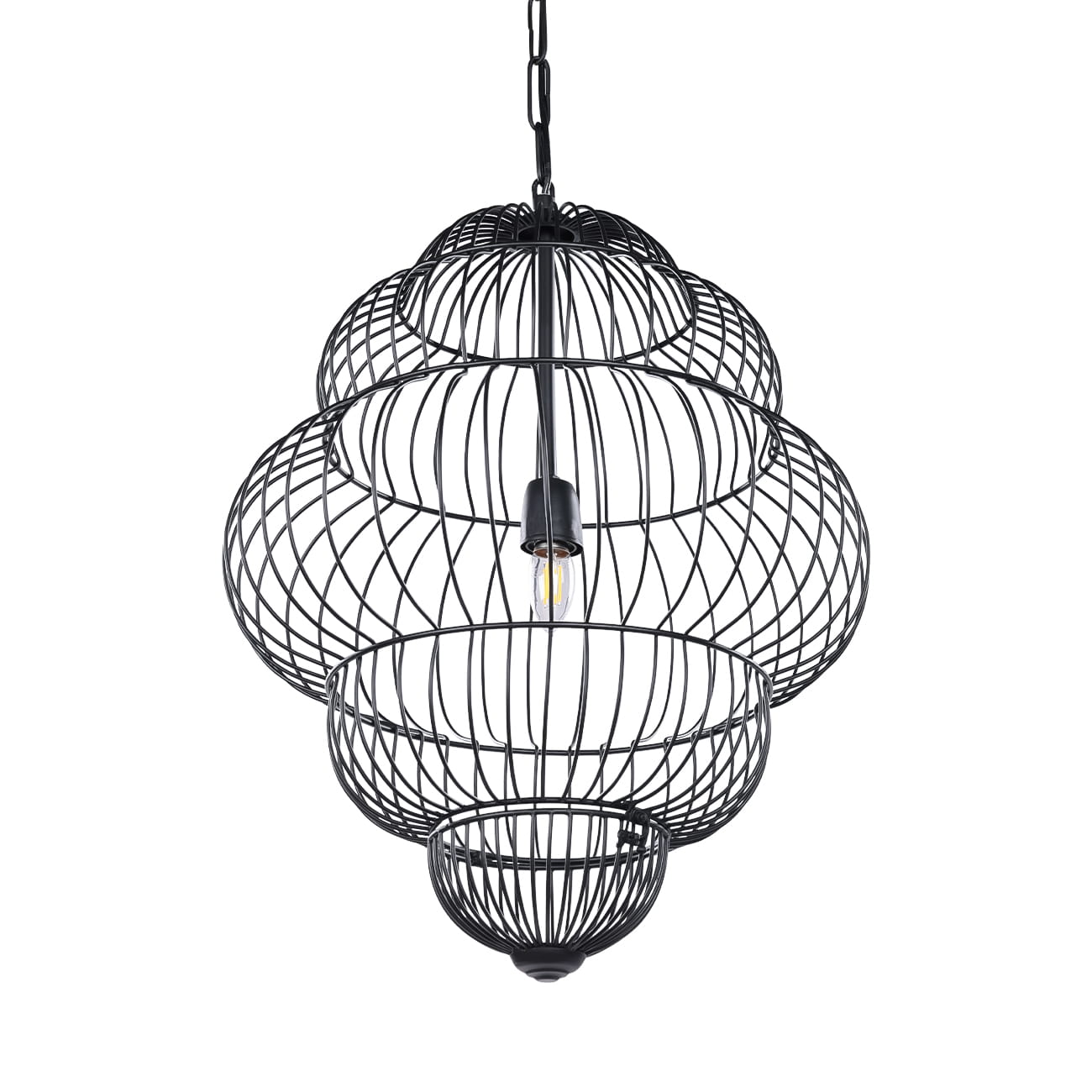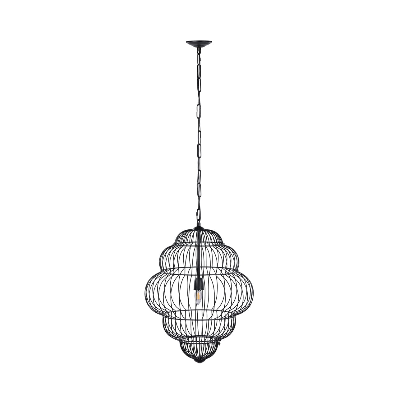 Konstrukcja wykonana została z metalu spawanego i wykończona w matowej czerni malowanej proszkowo. Otwarta, druciana struktura sprawia, że mimo swojej formy lampa pozostaje lekka wizualnie, a światło swobodnie przenika przez bryłę, tworząc miękkie cienie i przyjemną atmosferę.