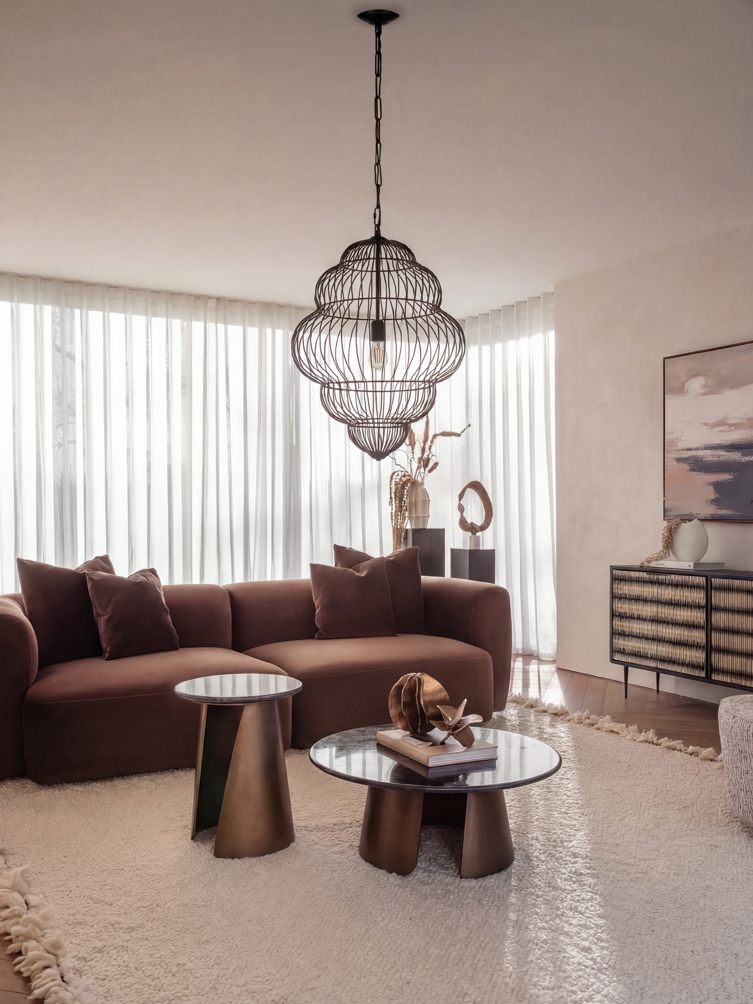 Dzięki regulowanej długości zawieszenia od 85 do 375 cm, lampa Mira Cloud doskonale sprawdzi się w klatkach schodowych, wysokich holach, nad antresolą oraz w salonach z wysokim sufitem. Jej pionowa kompozycja podkreśla wysokość wnętrza i nadaje mu eleganckich proporcji.