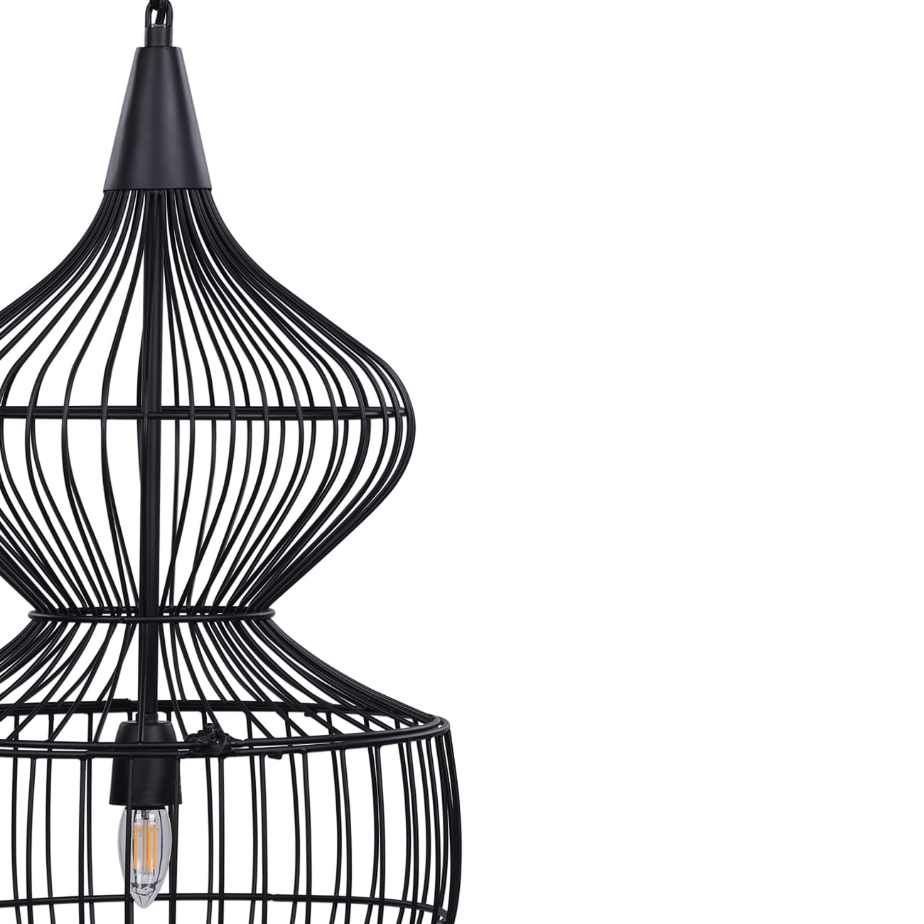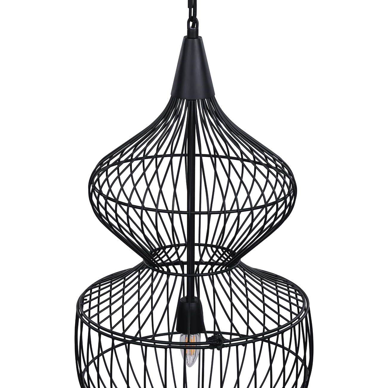 Konstrukcja wykonana została z metalu spawanego i wykończona w matowej czerni, co nadaje całości nowoczesny, zdecydowany charakter. Otwarta, druciana struktura sprawia, że mimo swojej skali lampa pozostaje lekka wizualnie, a światło swobodnie przenika przez formę.