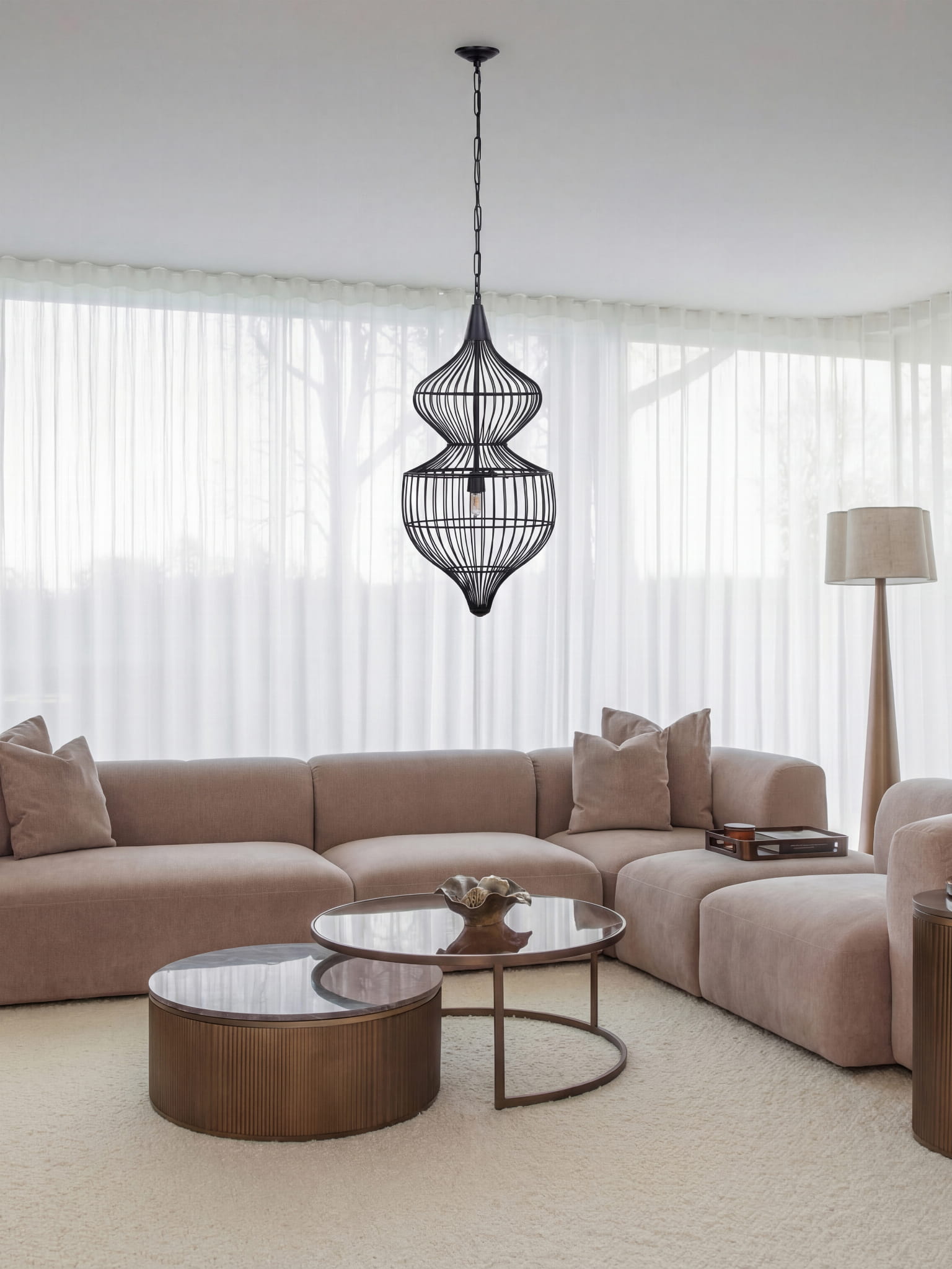 Dzięki regulowanej długości zawieszenia od 105 do 395 cm, lampa Mira Hourglass doskonale sprawdzi się w pomieszczeniach z wysokim sufitem, nad klatką schodową, w holu lub jako centralny punkt oświetleniowy w salonie.