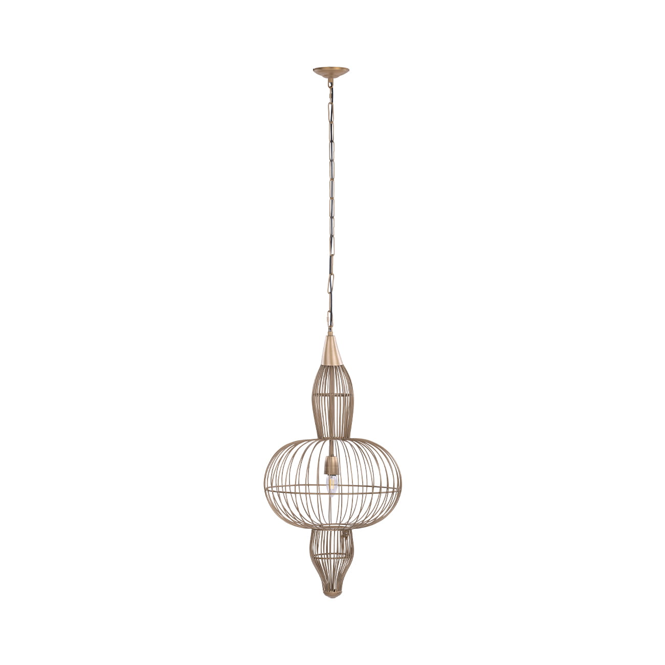 Klosz wykonany z metalu i wykończony w odcieniu satynowanego postarzanego mosiądzu emituje ciepły, miękki blask. Otwarta struktura pozwala światłu swobodnie przenikać przez formę, tworząc subtelne refleksy i nastrojowe cienie na ścianach oraz suficie.