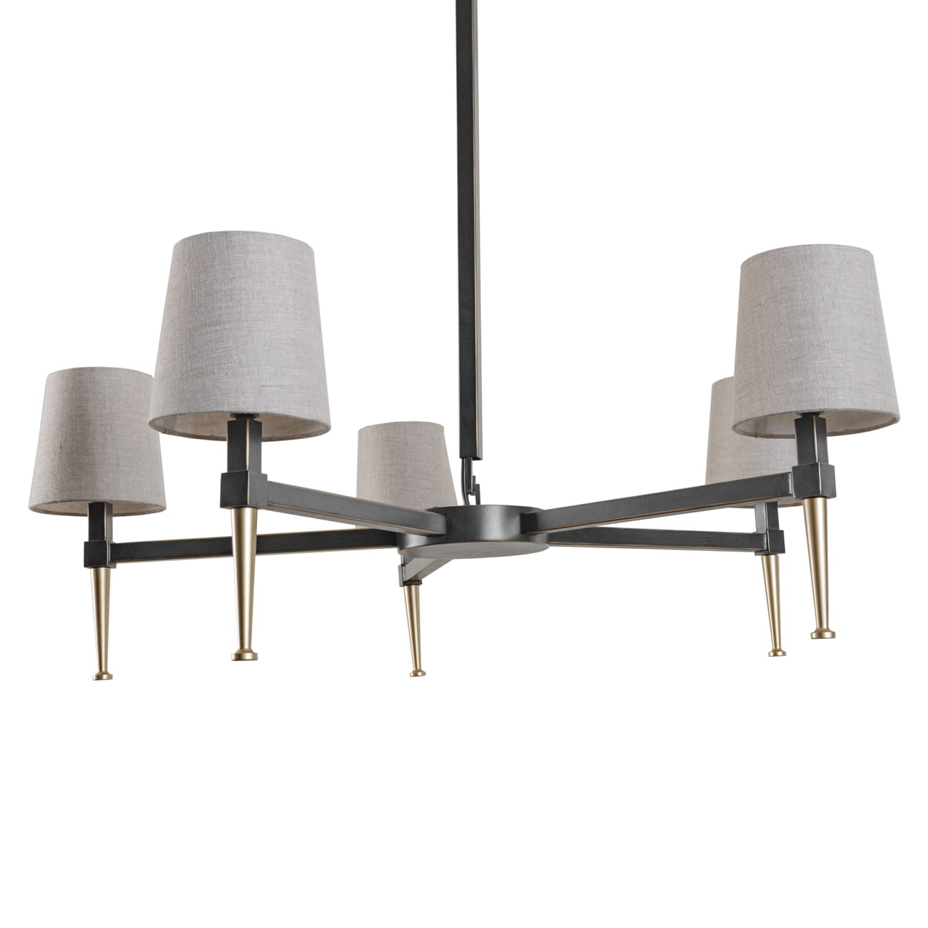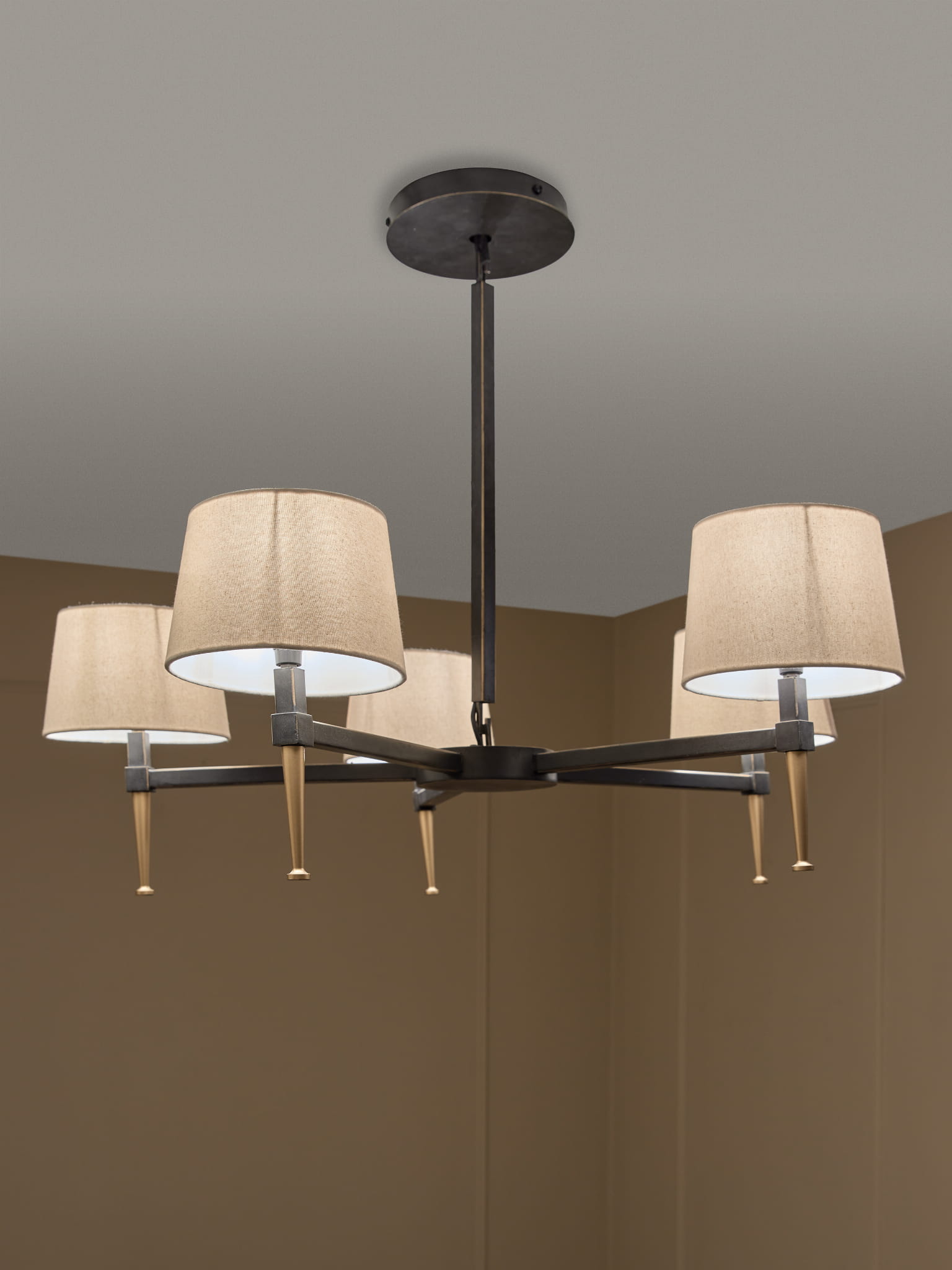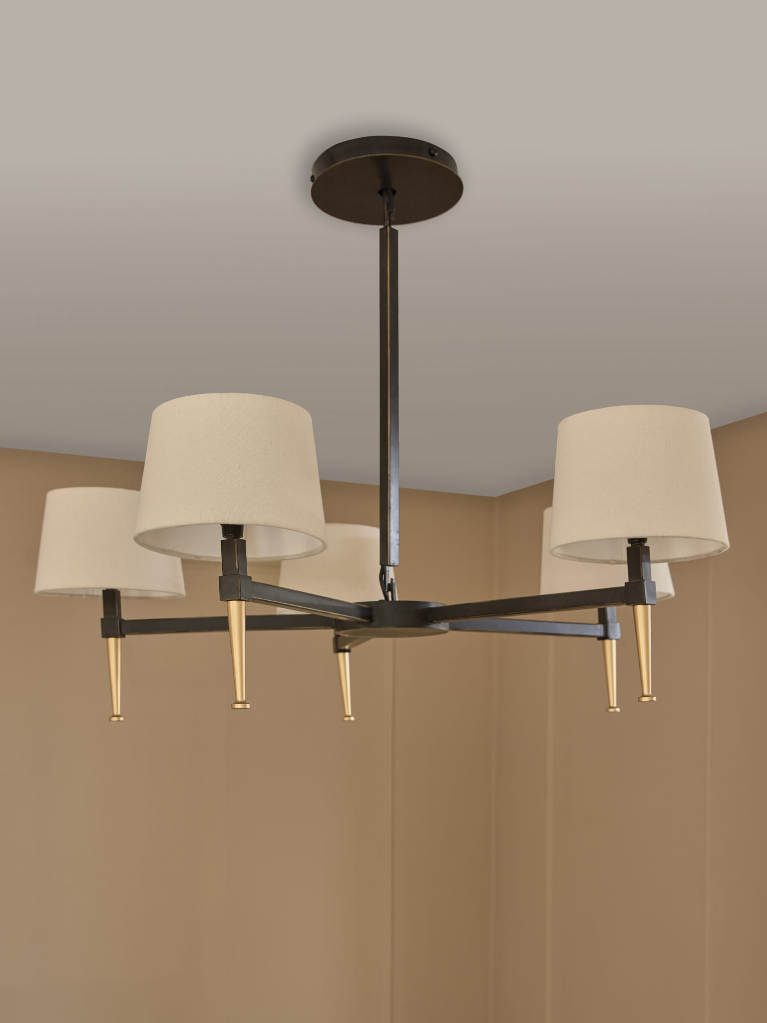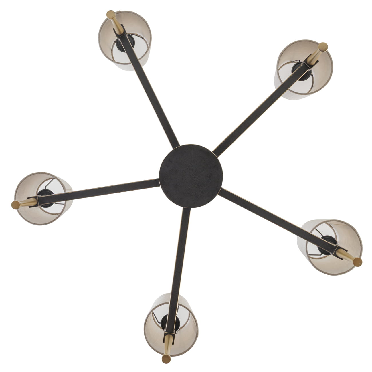 Żyrandol świecznikowy Stella 5 ramion czerń i złoto lniane abażury