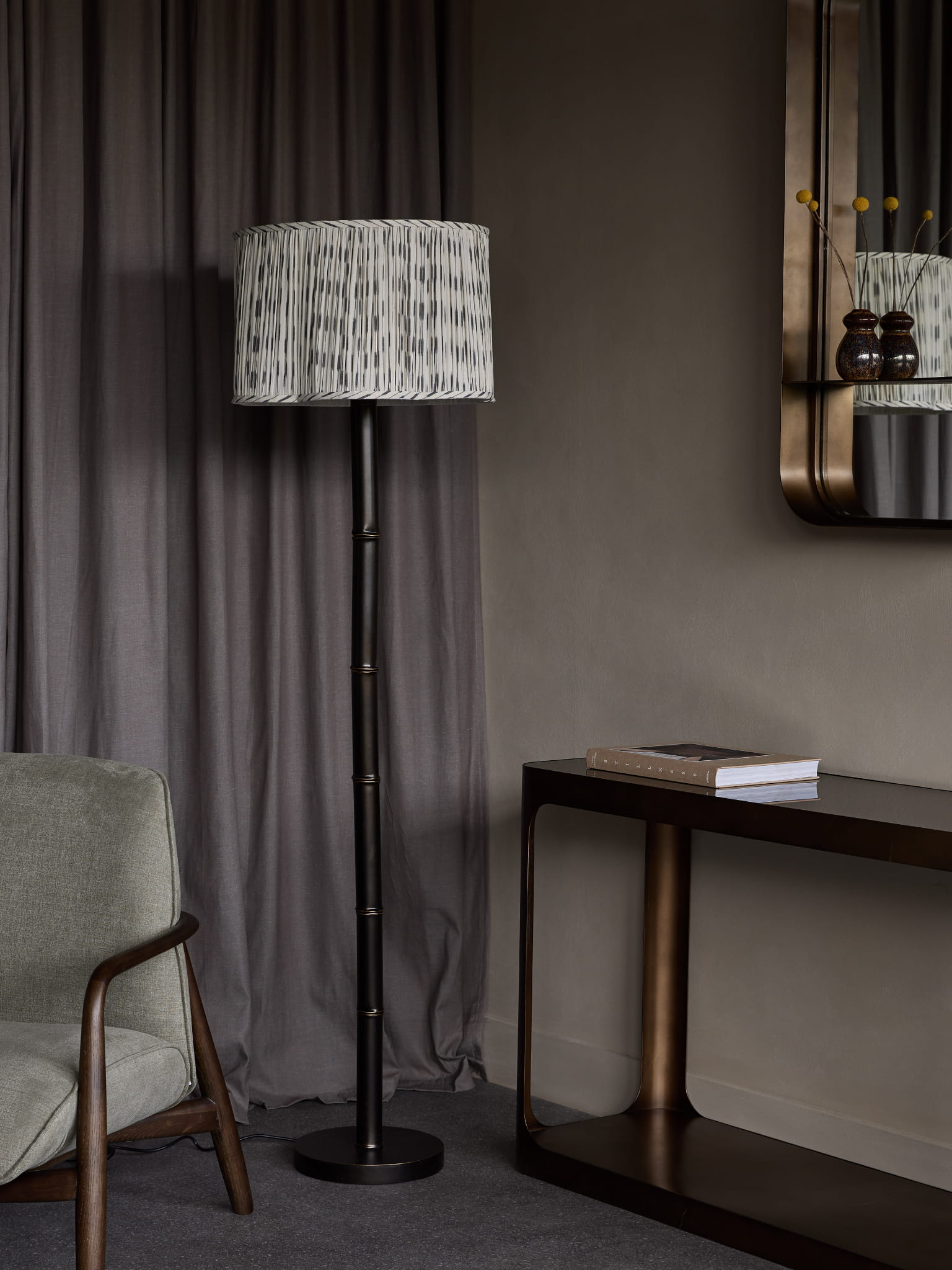 Lampa podłogowa Lexi doskonale odnajduje się we wnętrzach elegant, modern classic, boutique hotel, art déco oraz contemporary. Jej kolorystyka oparta na odcieniach czerni, brązu, bieli i brązu wpadającego w bronze sprawia, że łatwo zestawić ją z sofami, fotelami, drewnem, welurem, lnem i metalowymi dodatkami.