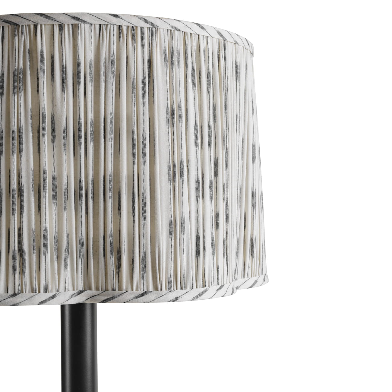 Szary abażur z plisowaniem i wzorem ikat nadaje lampie wyjątkowy wygląd. Dzięki tej fakturze światło zyskuje miękki, przyjemny charakter, a sama lampa prezentuje się niezwykle szlachetnie i dekoracyjnie.