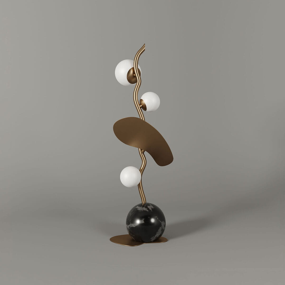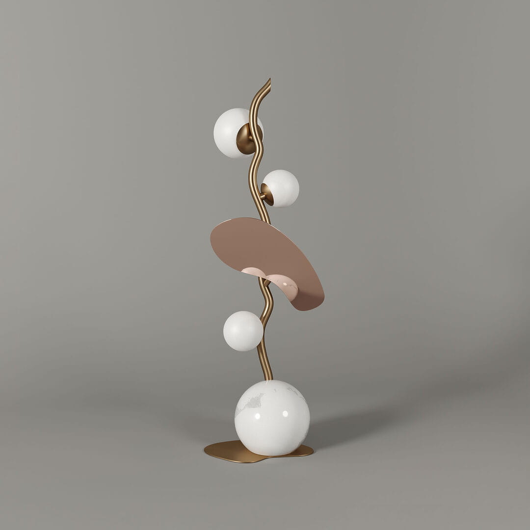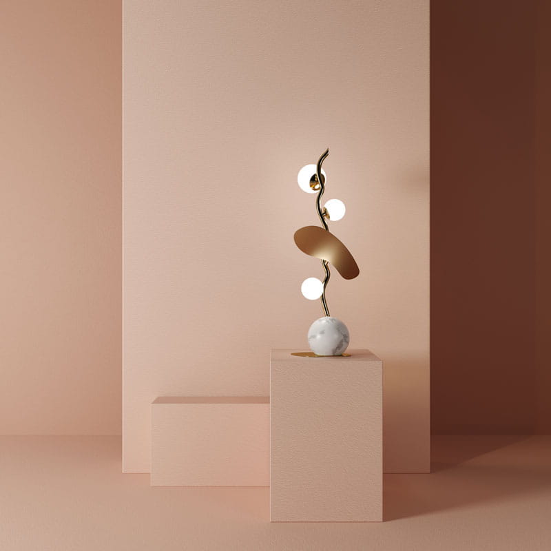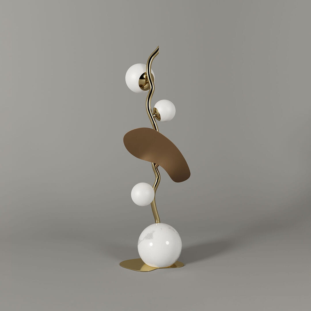 Zainspirowana kwitnącym drzewem migdałowca, ta stylowa lampa stołowa o wysokości 70 cm, wyposażona w białe, szklane klosze, zachwyci miłośników designu!