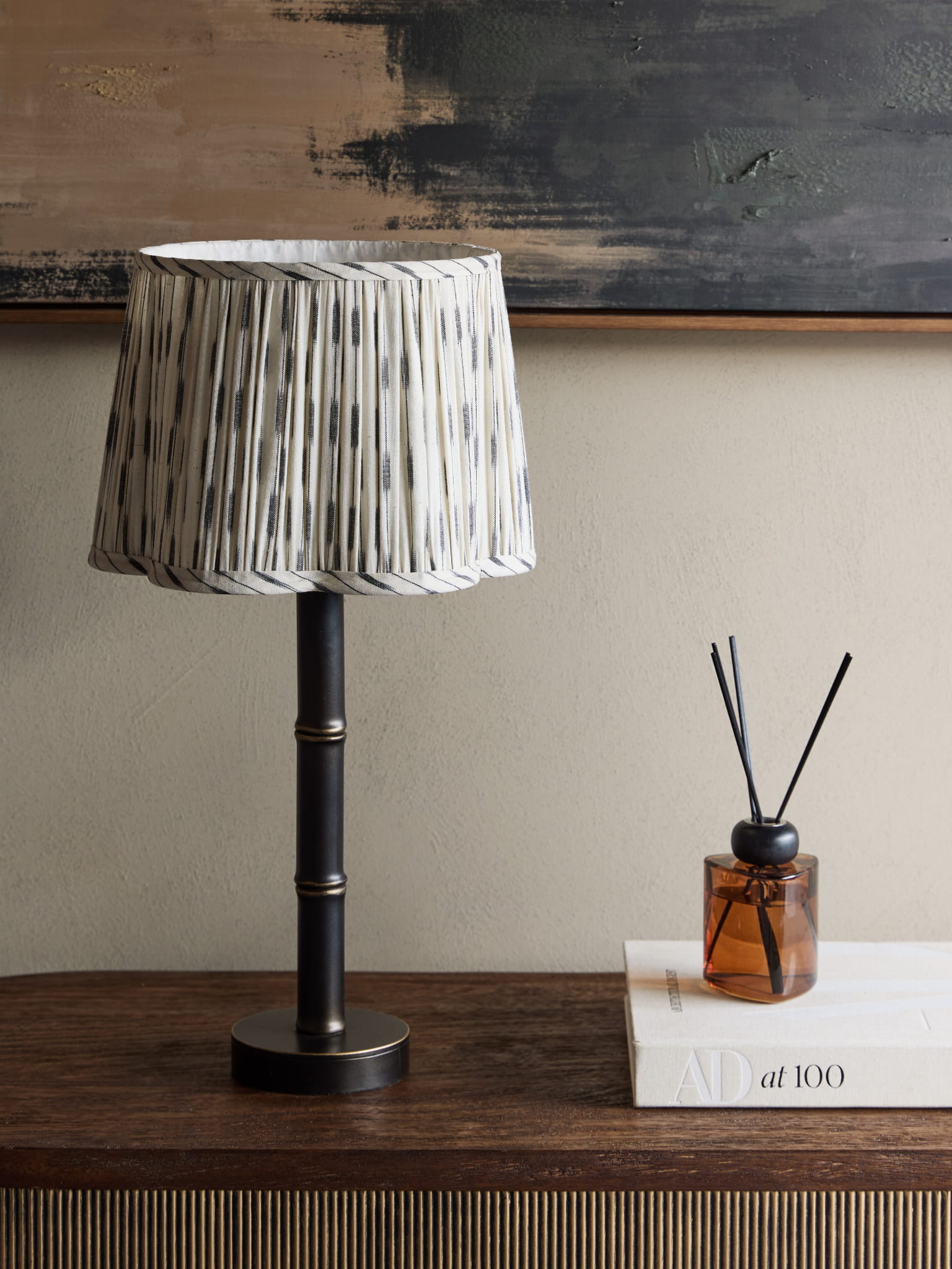 Lampa stołowa Lexi to kompaktowy, a zarazem wyrazisty element wystroju wnętrza, który łączy subtelną dekoracyjność z praktycznym zastosowaniem. Model przyciąga uwagę efektownym abażurem z tkaniny w odcieniu szarości z delikatnym wzorem ikat oraz rzeźbiarską podstawą inspirowaną formą bambusa. To połączenie nadaje lampie ponadczasowy, elegancki charakter i sprawia, że doskonale wpisuje się w aranżacje premium.