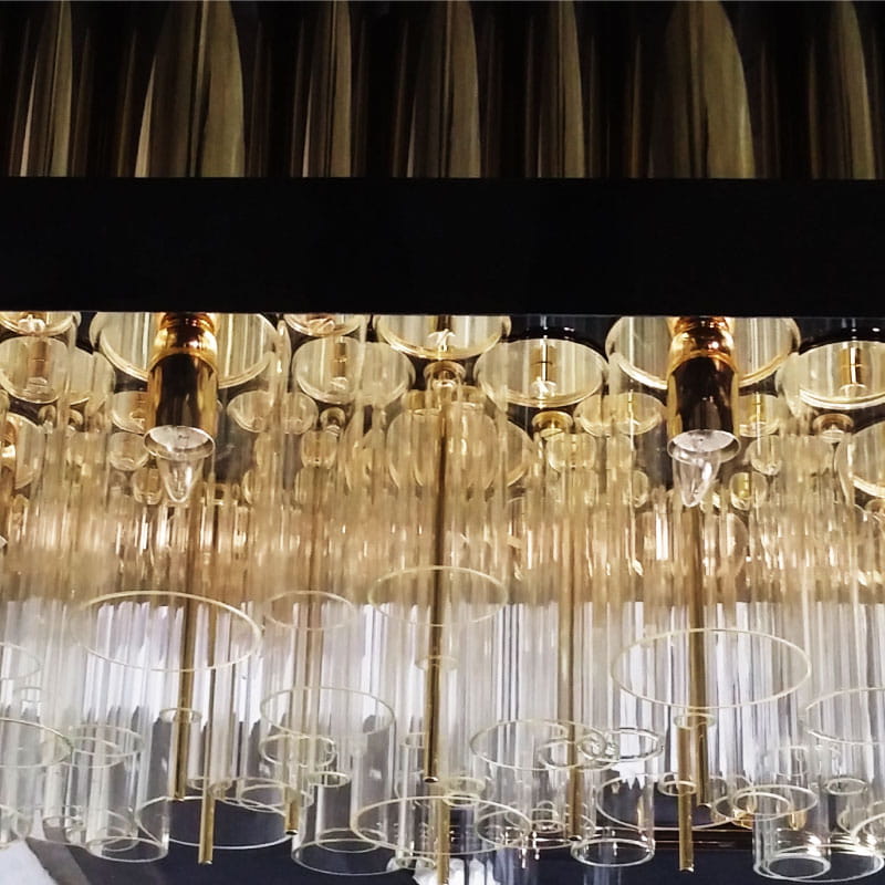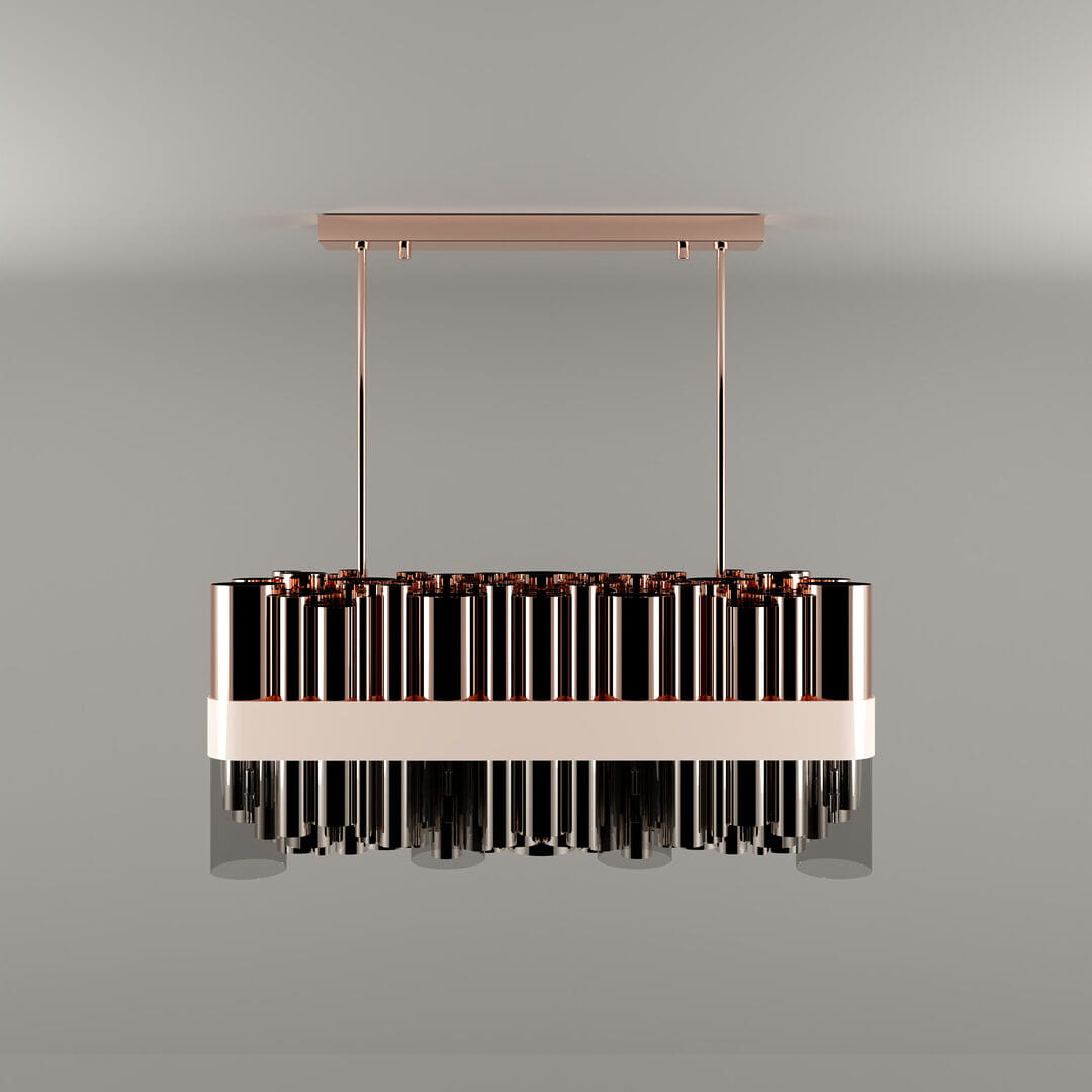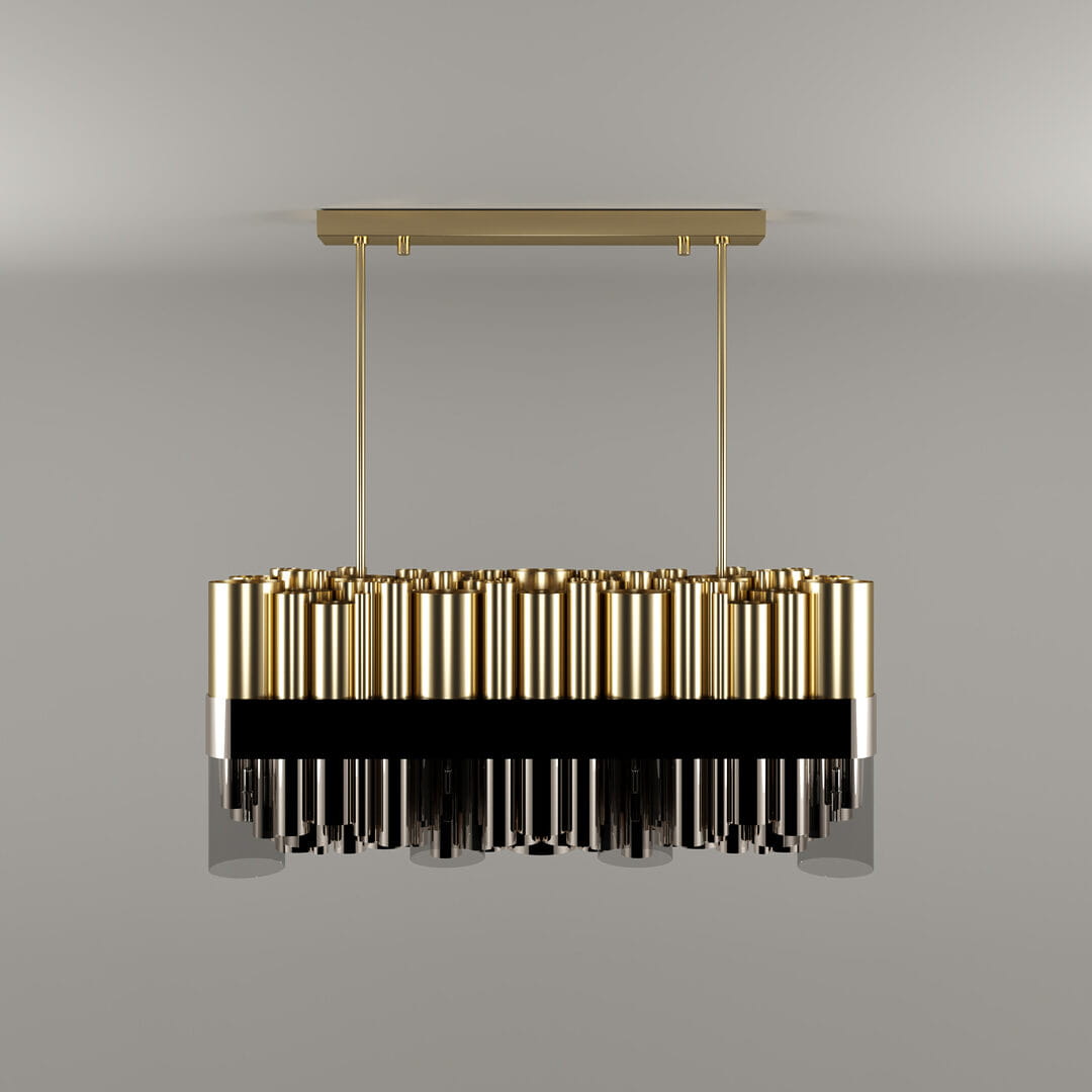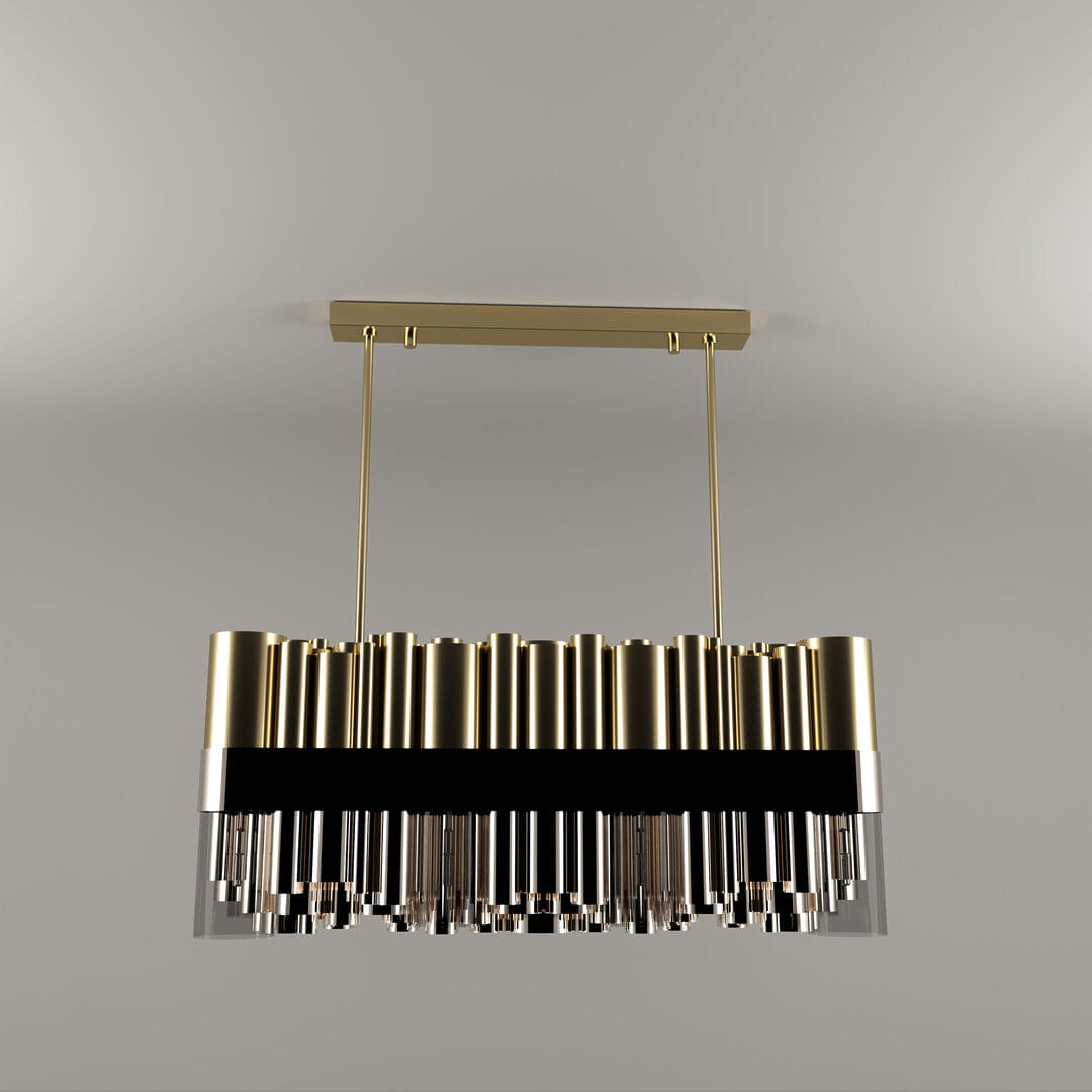 Nowoczesna lampa wisząca Granville czerpie inspirację z dramatycznego charakteru wyspy oraz panoramy Vancouver, tworząc imponujący element oświetlenia idealny do współczesnych wnętrz. Ta niezwykła lampa składa się z 99 rur wykonanych z mosiądzu pokrytego złotem, niklu oraz szkła, które zostały połączone elegancką wstęgą z czarnego lakierowanego mosiądzu.