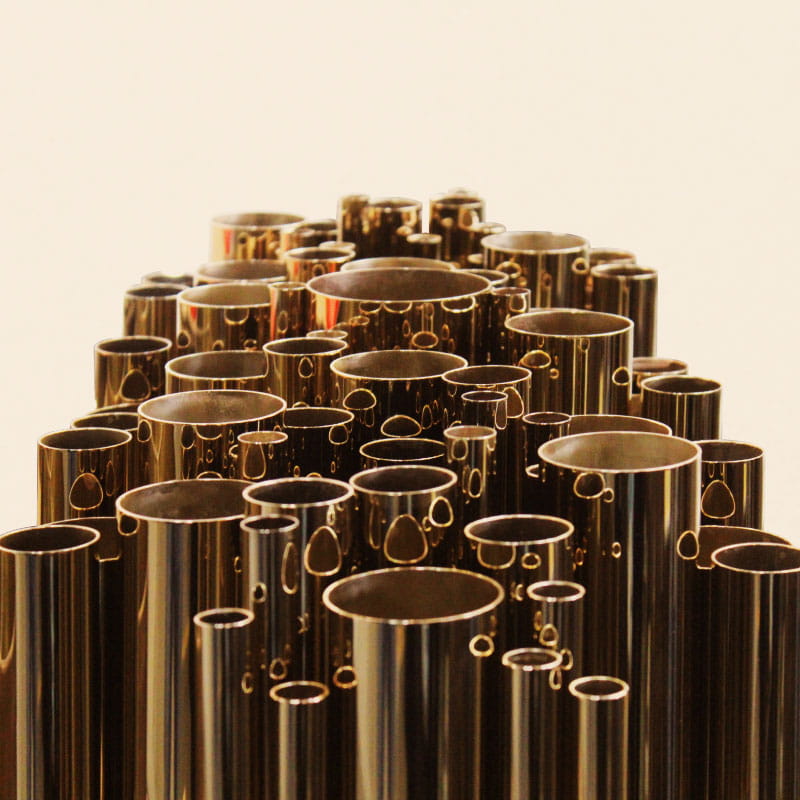- Majestatyczna forma: Warstwa mosiężnych rur tworzy unikalną, przestrzenną konstrukcję.