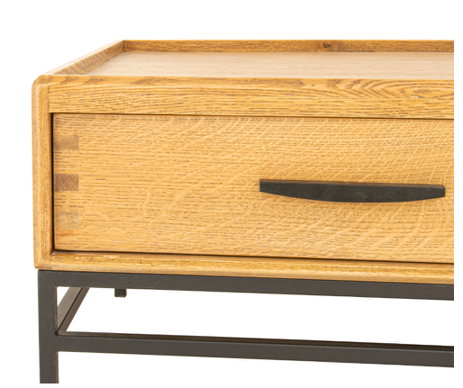Stolik kawowy Brue to designerska ława do salonu, która łączy elegancję naturalnego drewna z nowoczesną, metalową podstawą. Prostokątny blat z dębu, czarne drewniane uchwyty oraz stabilna konstrukcja tworzą mebel o wyrazistym charakterze, idealny do wnętrz nowoczesnych, skandynawskich, loftowych i inspirowanych stylem lat 50.