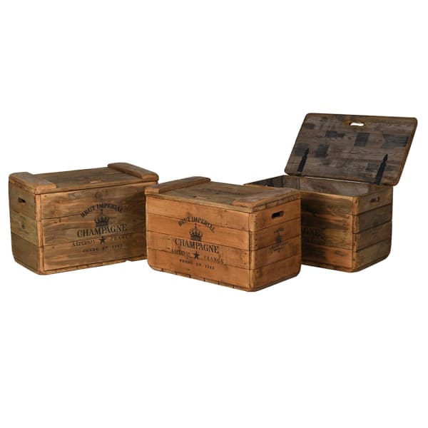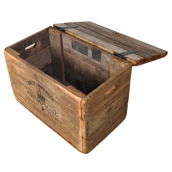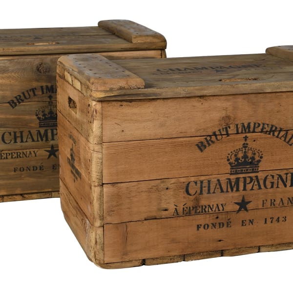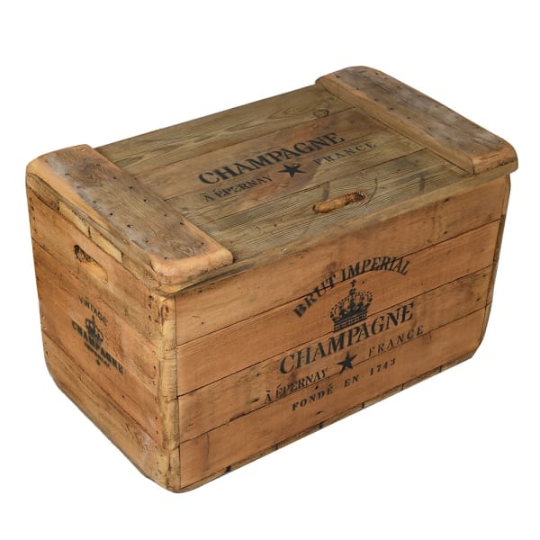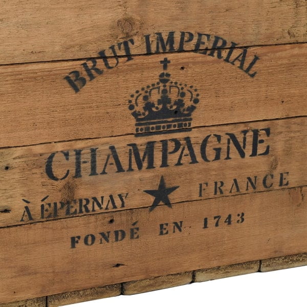 Skrzynia Champagne to wyjątkowy mebel dekoracyjny w stylu vintage, inspirowany klasycznymi kuframi transportowymi z francuskich domów szampańskich. Wykonana z naturalnego drewna, zachwyca autentycznym charakterem i starannie odwzorowanymi detalami. Nadruk „Brut Imperial Champagne – Épernay, France” przywołuje klimat dawnych winnic, dodając wnętrzu elegancji i duszy.