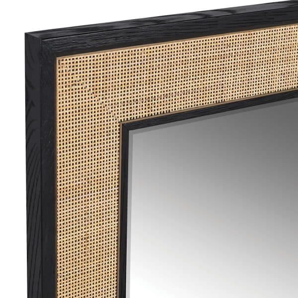 Ekskluzywne lustro w odcieniach czerni i beżu wyróżnia się bardzo dużym rozmiarem (jego szerokość to aż 85 cm). To piękne kwadratowe lustro zachwyca wykonaniem i oryginalnością projektu. Rama tego lustra, łącząca w sobie czarny dąb oraz rattan, nadaje efektywności i sprawia, że prezentuje się ono niezwykle efektownie.