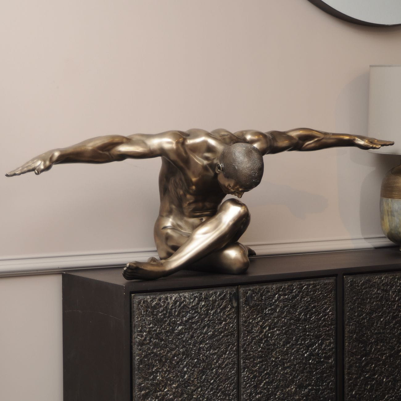 Prezentowana rzeźba mężczyzny Halycon Male została wykończona w brązie i przedstawia mężczyznę w klasycznej pozie z rozpostartymi ramionami. Jej duży rozmiar i kunszt wykonania sprawiają, że nie sposób przejść obok niej obojętnie.