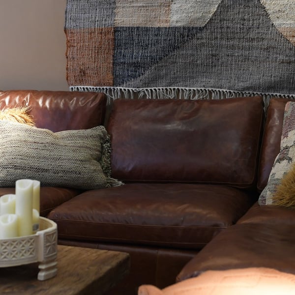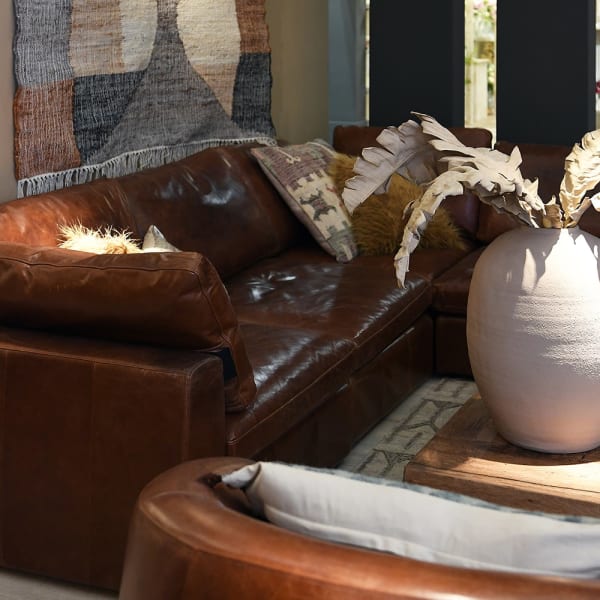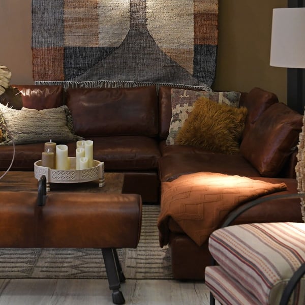 Skórzana kanapa modułowa - sofa narożna pokryta brązową skórą