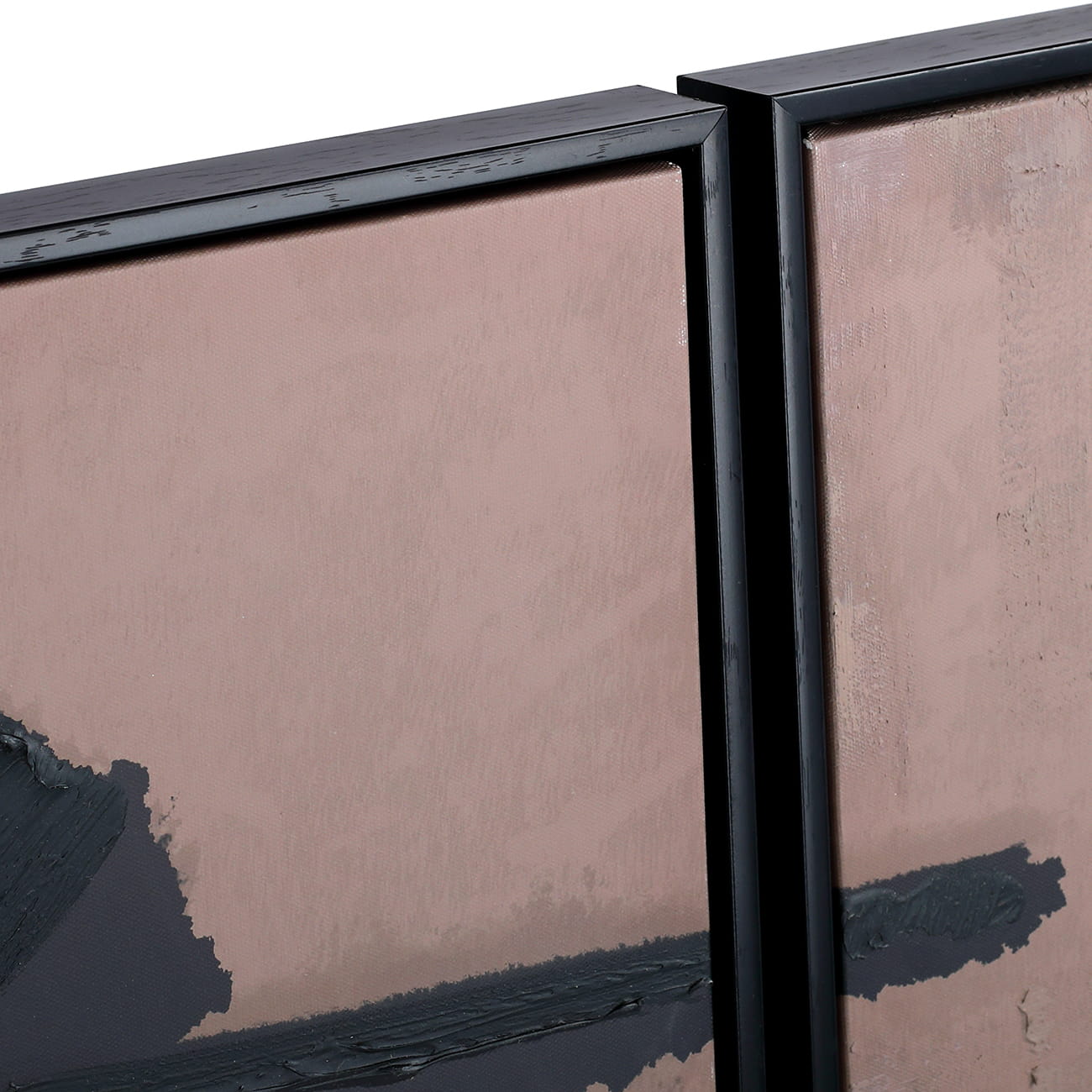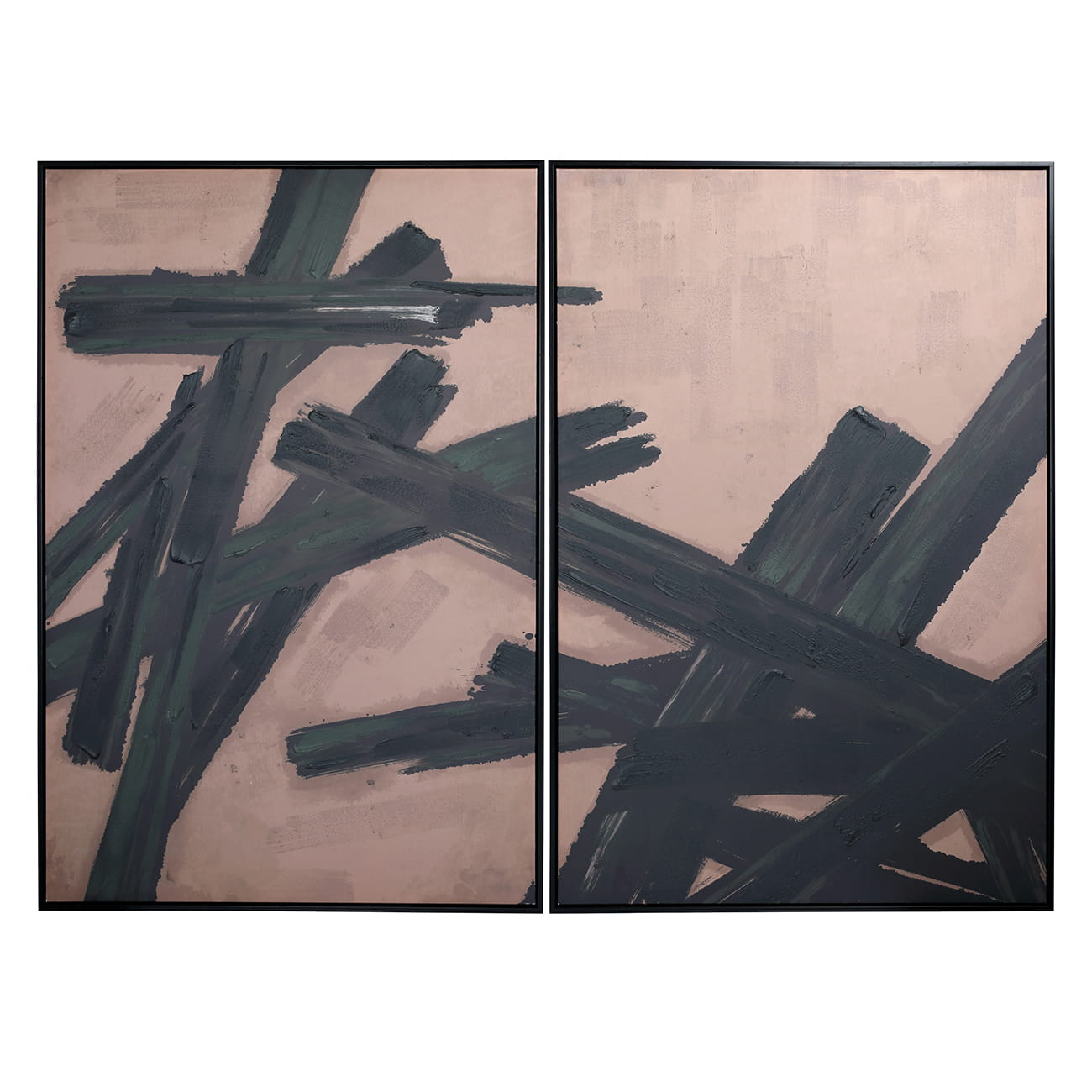 Ta piękna dekoracja na ścianę składa się z dwóch oprawionych płócien, z których każde prezentuje szereg śmiało namalowanych, czarnych pociągnięć pędzla. Każde z nich zostało następnie wzmocnione grubszą warstwą farby, nakładaną ręcznie przy użyciu tradycyjnych narzędzi, pozostawiając widoczną fakturę na powierzchni płótna. Ta technika malarska, zyskująca popularność dzięki klasycznym artystom takim jak Van Gogh i Rembrandt, nosi nazwę „impasto".