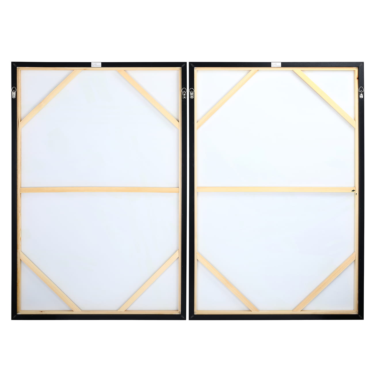Każde płótno ma wymiary 120 cm x 80 cm, oba są indywidualnie oprawione czarną ramą imitującą drewno. Zawieszone są wyłącznie w orientacji pionowej, na dwóch wbudowanych haczykach (nie są dołączone do zestawu).