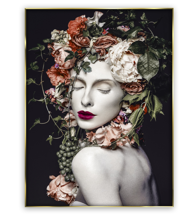 Szklany obraz Flower Crown prezentujący dziewczynę w kolorowym, kwiecistym wianku, wyróżnia się nie tylko artystyczną formą i przekazem, ale również złotą ramą, która w doskonały sposób zamyka to prawdziwe dzieło sztuki.