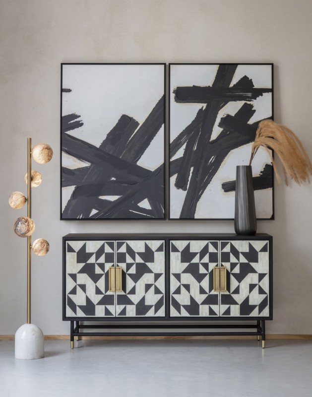 Ta piękna dekoracja ścienna składa się z dwóch oprawionych płócien, z których każde prezentuje szereg śmiało namalowanych, czarnych pociągnięć pędzla. Każde z nich zostało następnie wzmocnione grubszą warstwą farby, nakładaną ręcznie przy użyciu tradycyjnych narzędzi, pozostawiając widoczną fakturę na powierzchni płótna. Ta technika malarska, zyskująca popularność dzięki klasycznym artystom takim jak Van Gogh i Rembrandt, nosi nazwę „impasto".