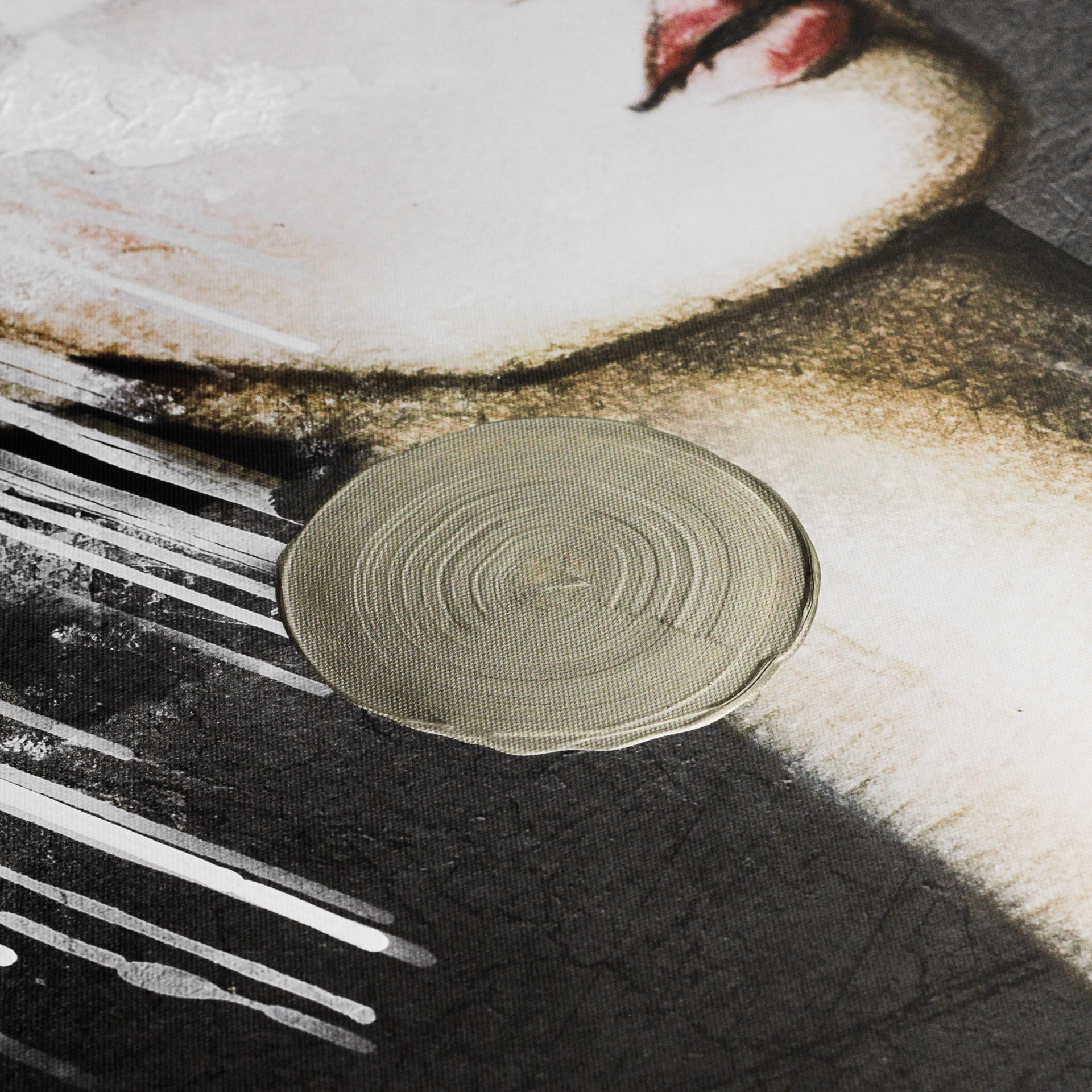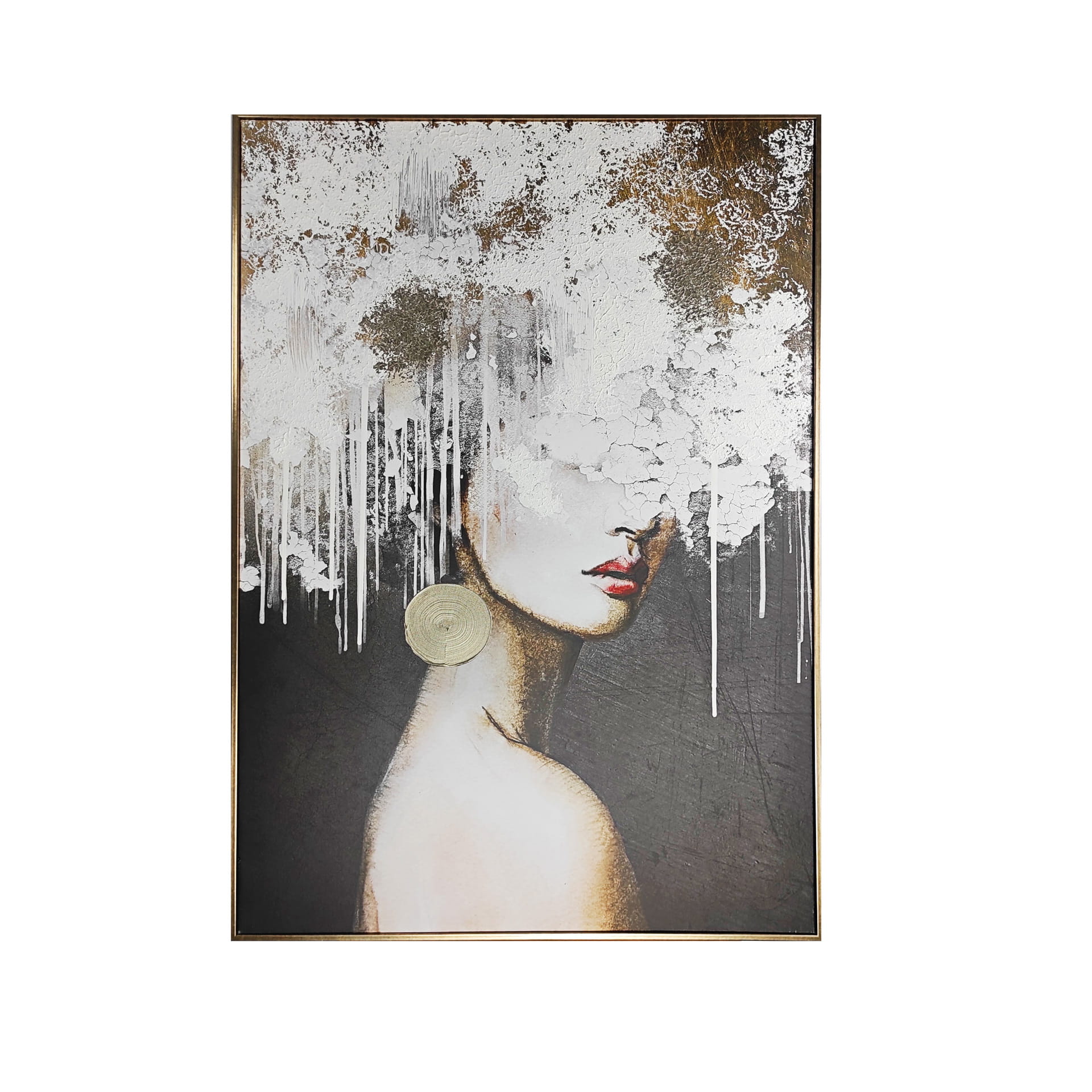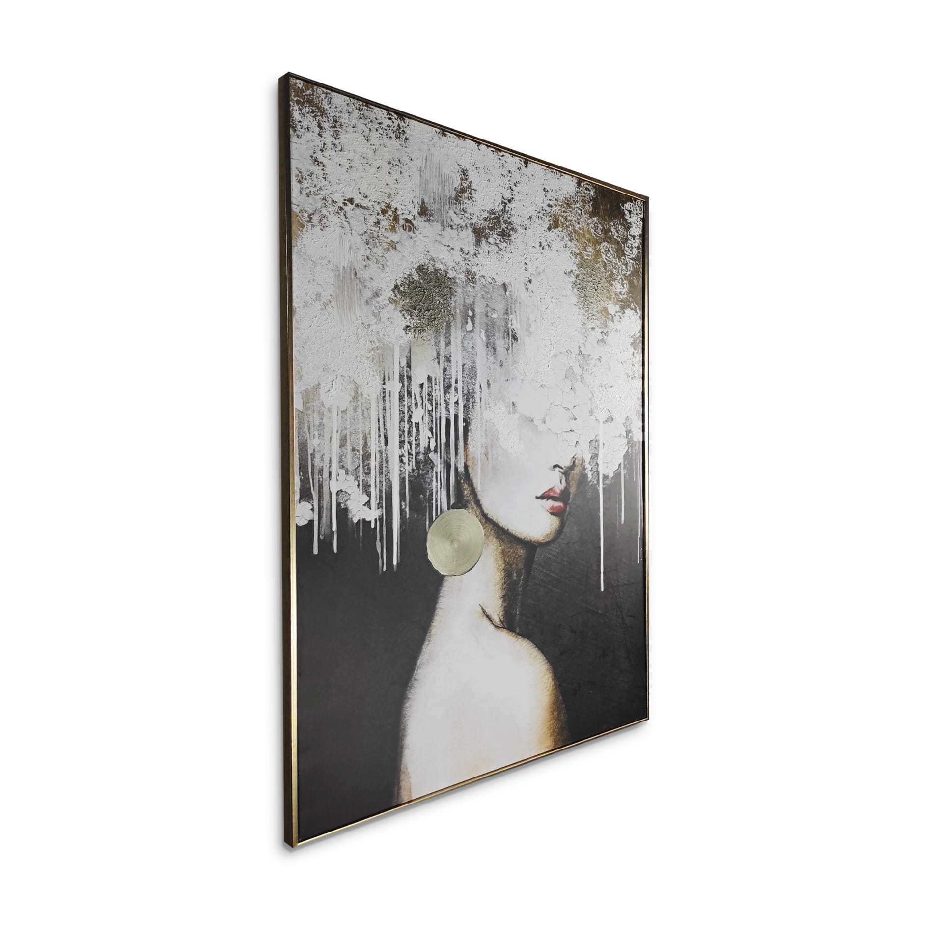 Paleta barw obrazu obejmuje złoto, czerń i biel, co nadaje mu elegancji i wyrazistości. Duży, jasny wianek na głowie kobiety wprowadza element świeżości, a jednocześnie jego mocno abstrakcyjne wykonanie sprawia, że obraz ten prezentuje się nowocześnie, podczas gdy złote akcenty dodają mu luksusu i klasy.