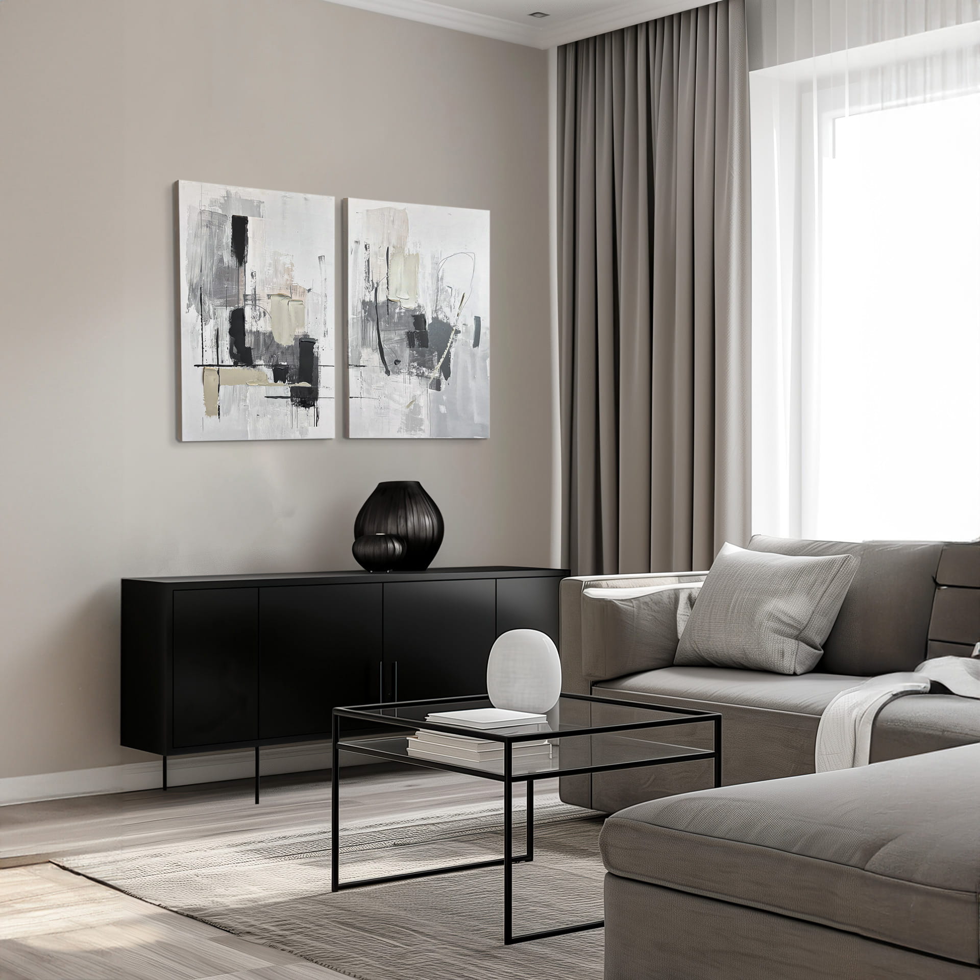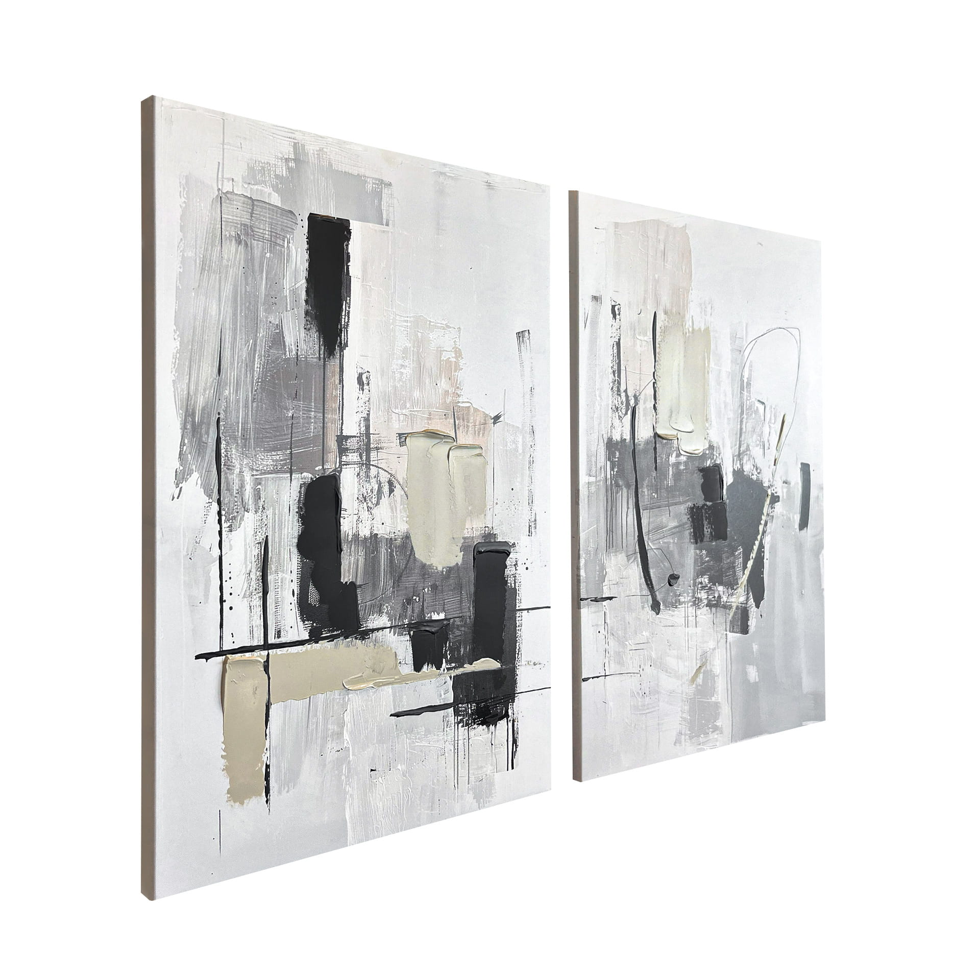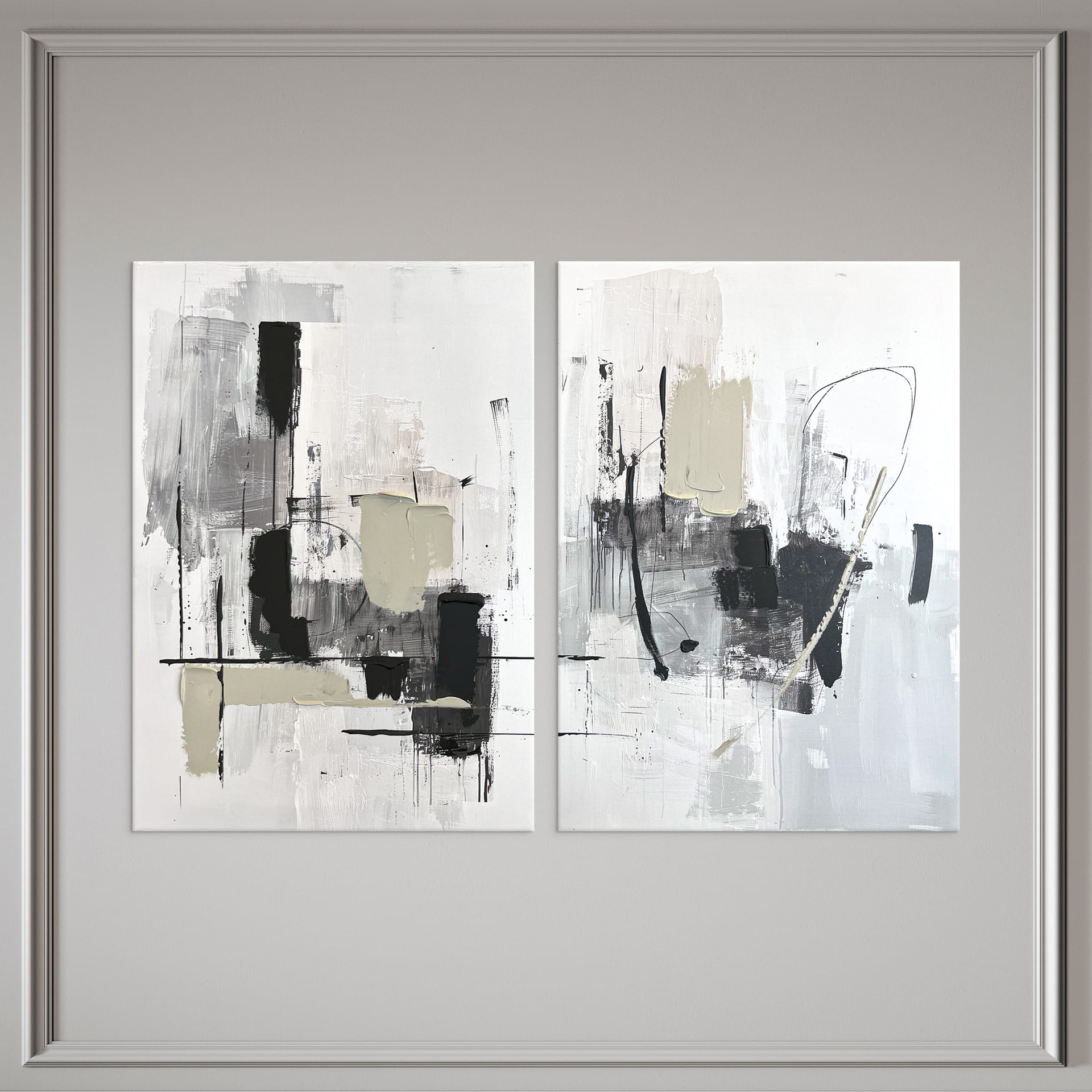 Zobacz, jak pięknie ten dyptyk w odcieniach bieli, beżu i czerni może prezentować się powieszony w Twoim salonie lub jadalni. Odkryj wyjątkowe, abstrakcyjne dekoracje, idealne do nowoczesnej przestrzeni życiowej.