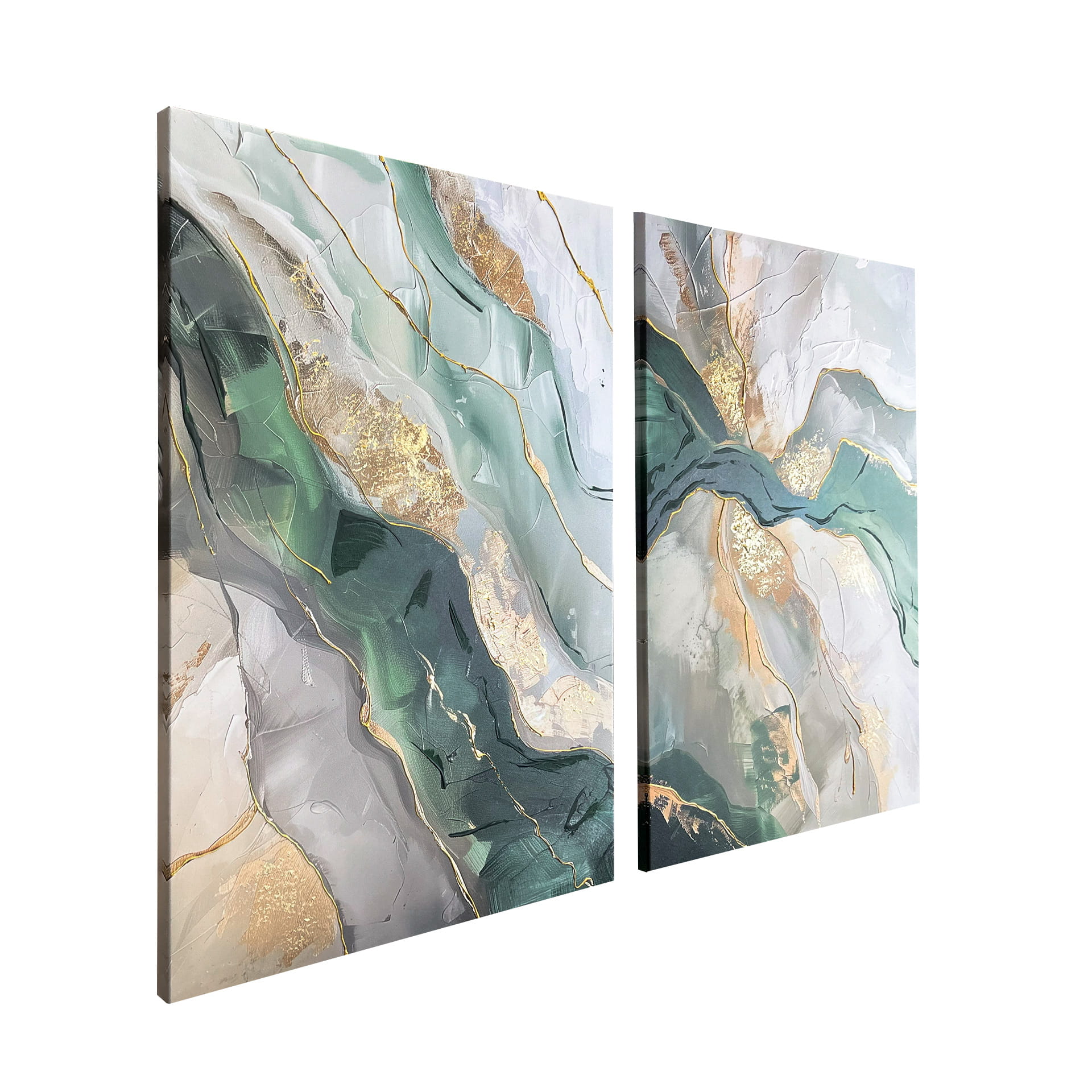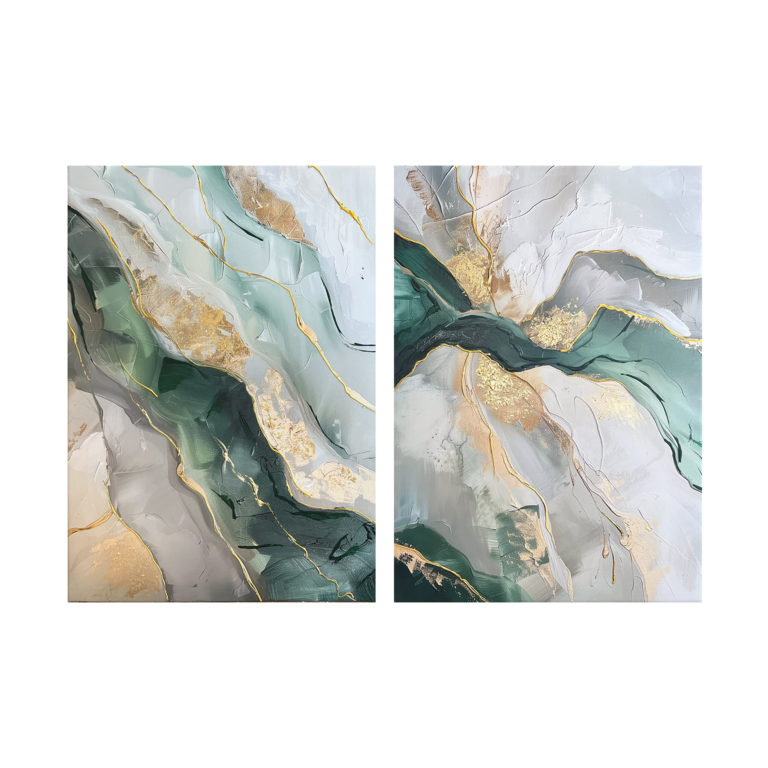 Zobacz, jak pięknie ten dyptyk w odcieniach zieleni i złota może prezentować się powieszony w Twoim salonie lub jadalni. Odkryj wyjątkowe, abstrakcyjne dekoracje, idealne do nowoczesnej przestrzeni życiowej.