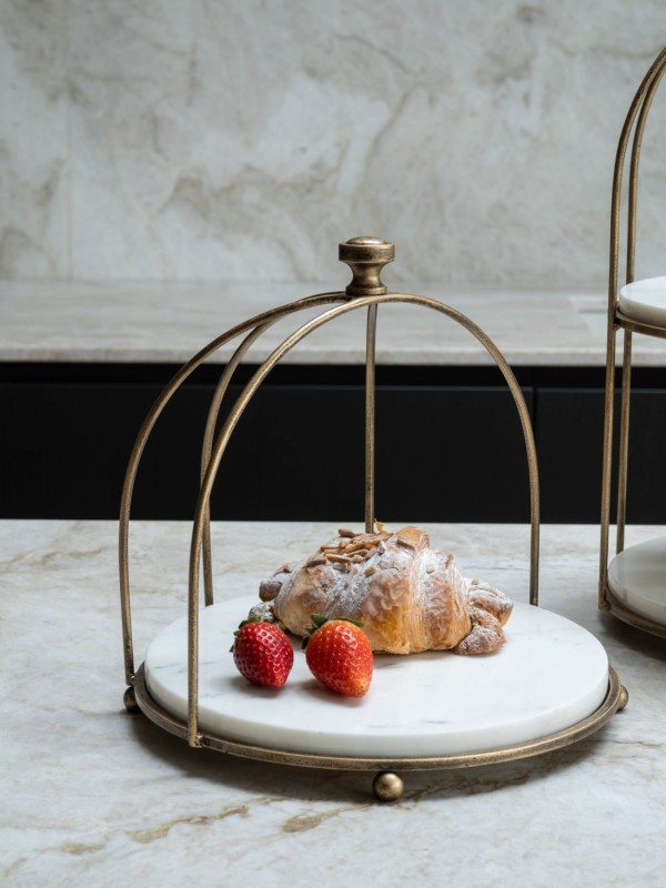 Urozmaić swoje wnętrze dzięki paterze Pimlcio – harmonijnemu połączeniu surowego metalu i jasnego marmuru. Ten stojak na ciasta, w odcieniach antycznego złota i bieli, zachwyca wysokiej jakości wykończeniem. Doskonale sprawdzi się jako elegancka misa na owoce, ciasta lub przedmioty dekoracyjne. Zaaranżujesz ten piękny stojak na stole w jadalni, stoliku kawowym, jak również na wyspie kuchennej!
