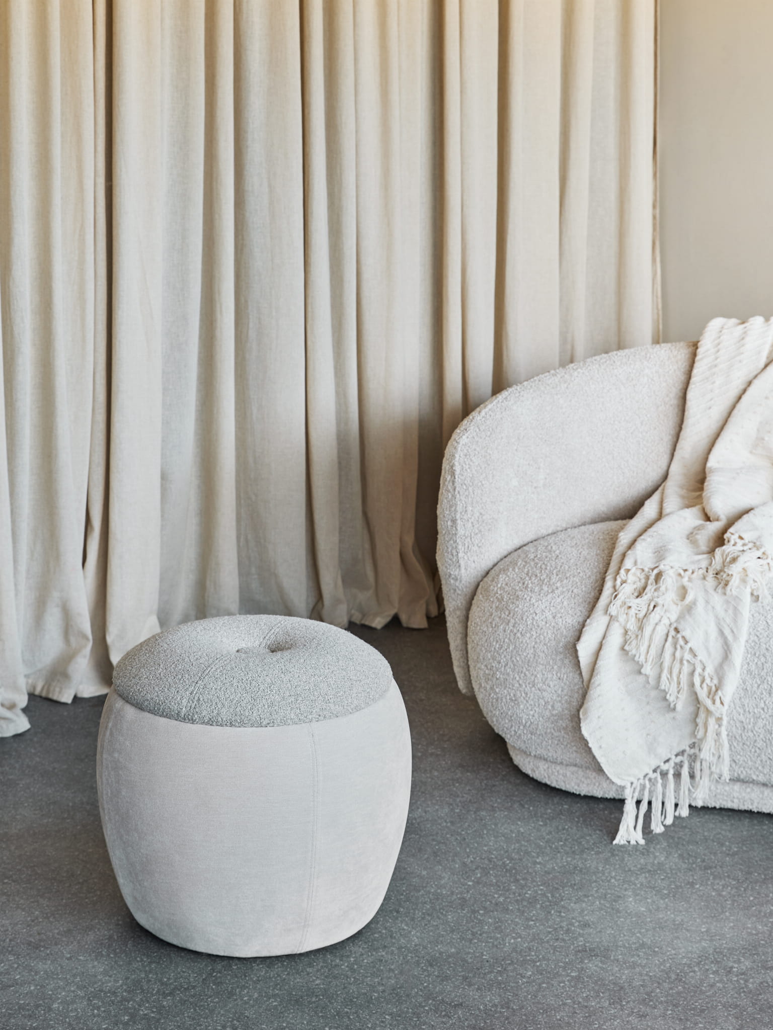 Połączenie gładkiego weluru z fakturalną tkaniną boucle nadaje pufie Pimlico luksusowego, a jednocześnie naturalnego charakteru. Neutralna kolorystyka sprawia, że beżowa pufa do wnętrz doskonale komponuje się z aranżacjami nowoczesnymi, skandynawskimi, japandi oraz modern classic. Dla spójnego efektu wizualnego pufę można zestawić z ławką ze schowkiem Pimlico.