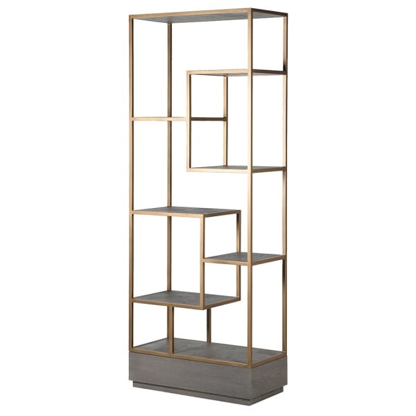 Regał Camile Oak 211x80 cm szary dąb żelazna rama w kolorze mosiądzu liczne wewnętrzne półki