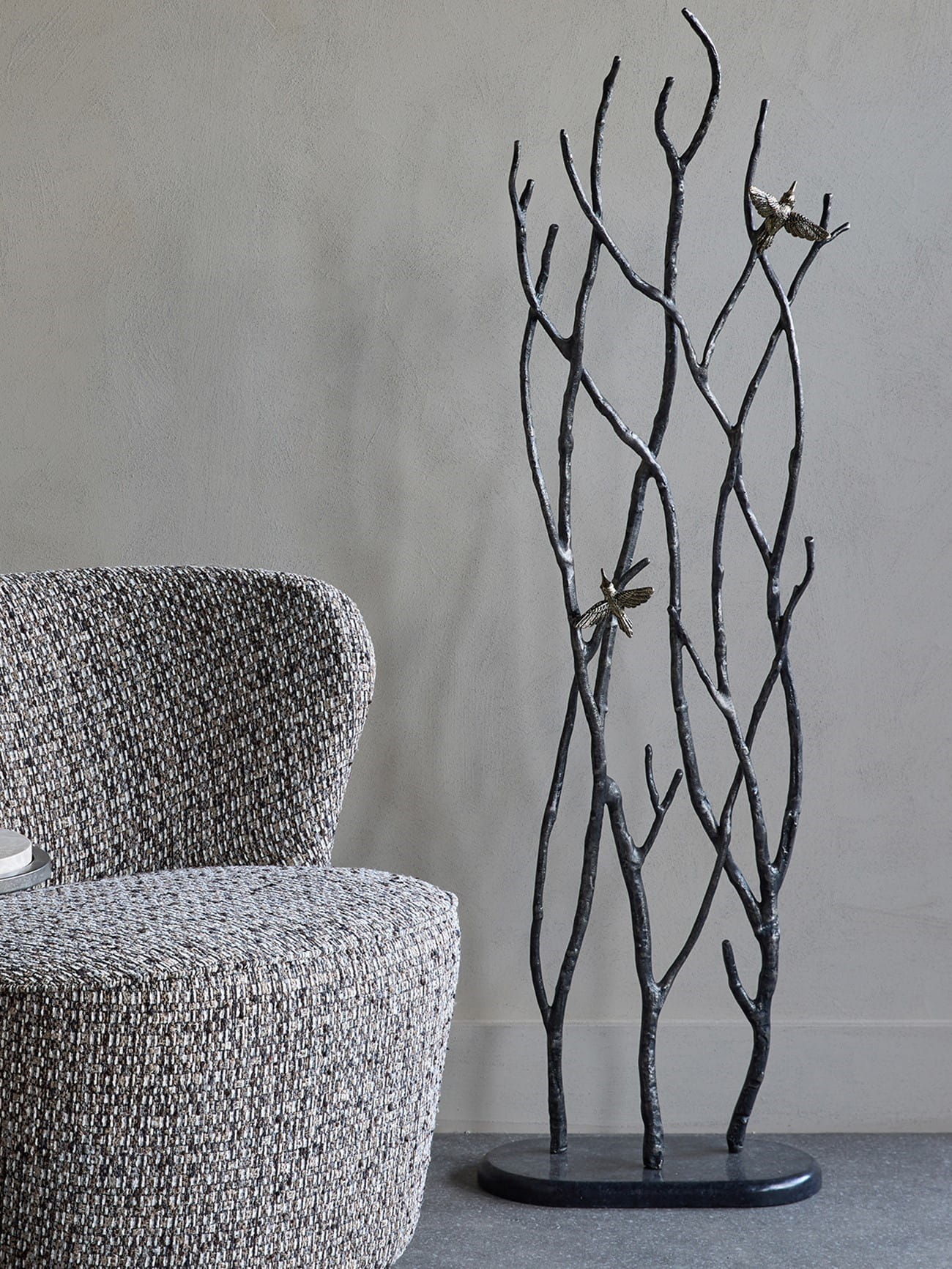 Ta dekoracyjna rzeźba podłogowa została wykonana ręcznie z aluminium i przedstawia gałęzie oraz ptaki. Masywna, odlewana podstawa ma ciemne grafitowe wykończenie, a delikatne gałęzie z ptakami zostały podkreślone kolorem antycznego mosiądzu. To unikalne dzieło, które sprawdzi się jako wyrazista dekoracja lub stylowa przegroda.