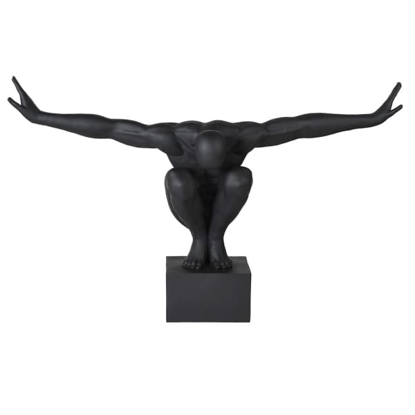 Halycon Black to efektowna, duża rzeźba do salonu, która natychmiast przyciąga uwagę i nadaje wnętrzu wyrazisty, luksusowy charakter. Dynamiczna sylwetka mężczyzny-gimnastyka z rozpostartymi ramionami symbolizuje siłę, równowagę i harmonię. Głęboka, matowa czerń podkreśla nowoczesny styl dekoracji, dzięki czemu rzeźba doskonale komponuje się zarówno z minimalistycznymi, jak i bardziej klasycznymi aranżacjami.