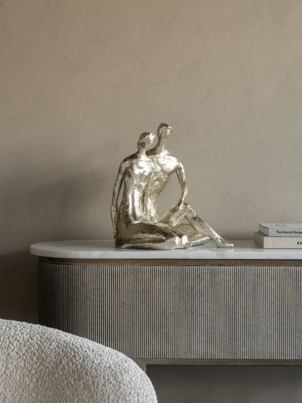 Rzeźba do salonu Lyall Copule, wykończona w żywicy o pięknym odcieniu jasnego, szampańskiego złota, stanowi nie tylko dekoracyjny przedmiot do salonu, ale także niosącą ze sobą piękną symbolikę ozdobę. Prezentująca zakochaną parę, ta złota rzeźba ukazuje spokojny moment bliskości. Delikatnie szorstka faktura dodaje ciepła i charakteru, podkreślając jej urok. Ta rzeźba wnosi elegancję do każdego wnętrza i stanowi wzruszający prezent na wyjątkowe okazje.