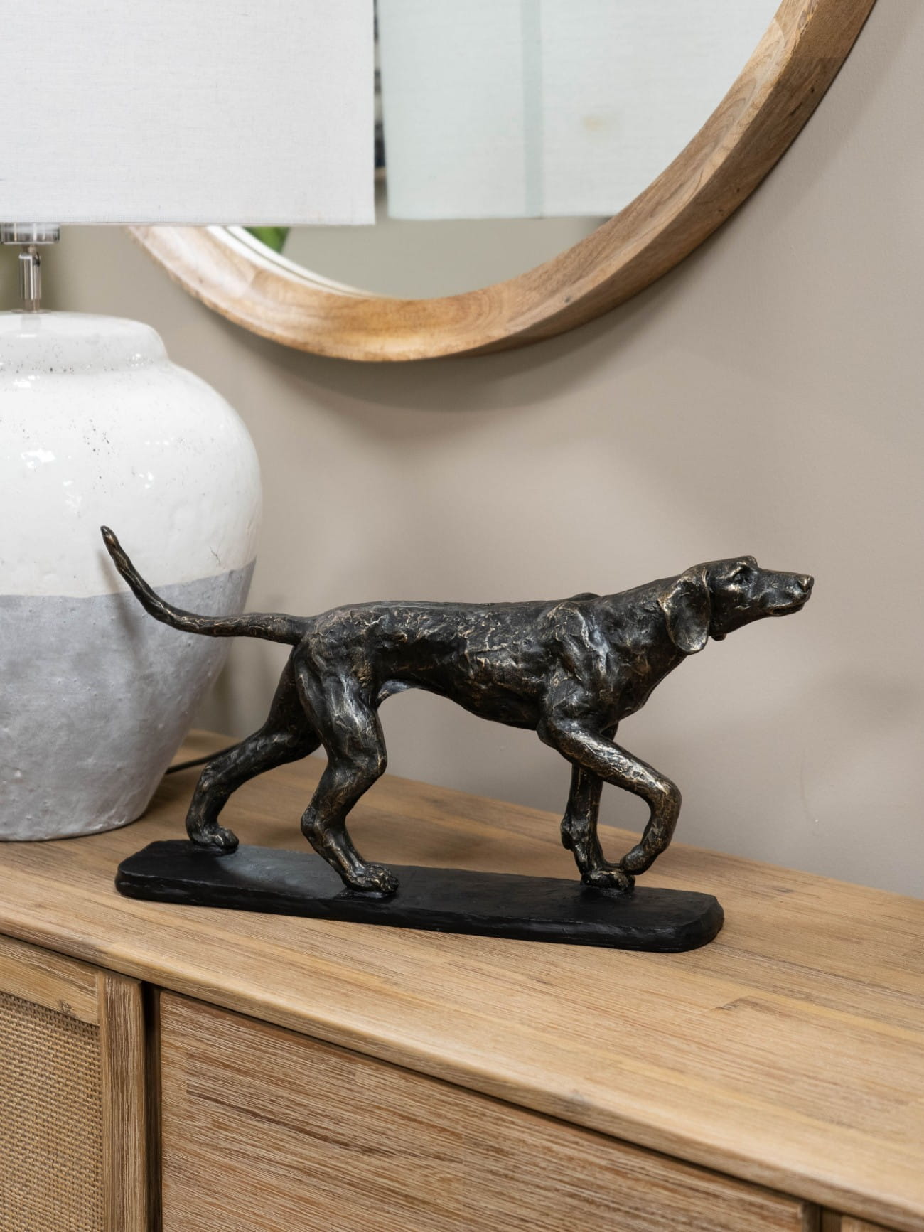 Ta piękna rzeźba psa doskonale spełni funkcję dekoracyjną postawiona na regale lub stoliku bocznym. Z powodzeniem umieścisz ją w salonie, sypialni, a także w przedpokoju.
